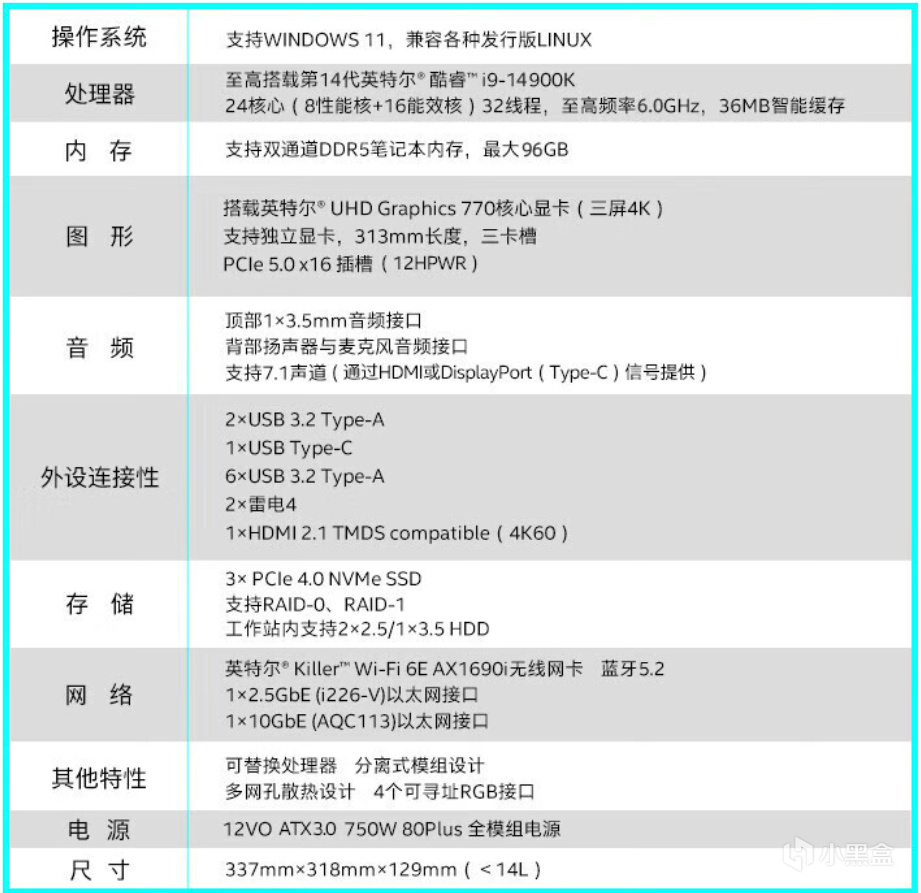 所以,我这里给大家抛出来一个提示, 如果你打算装一套高配ITX主机的,比如14700K+4070S或以上配置,不妨去看一看品牌整机,比如猛禽峡谷虽然算是13代NUC,在2024年它依然很强大,可以支持14900K,双雷电4双万兆网口扩展至今仍无对手。还有就是ROG 冰刃X,10L小体积兼顾性能和颜值信仰,都是可以考虑的。