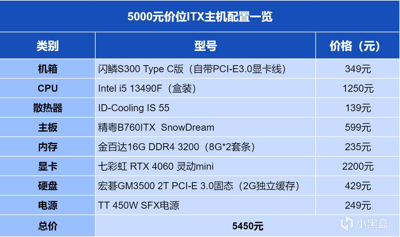 这么这是一个5000多元的ITX配置,基本足够一般游戏和办公使用。里面有一些配件比较节省,比如电源、主板和硬盘,预算多可以多花一点钱。当然也可以更省钱一些,比如CPU换成12400F,主板降级成H610 ITX主板等等,差不多可以控制在5000元以内。