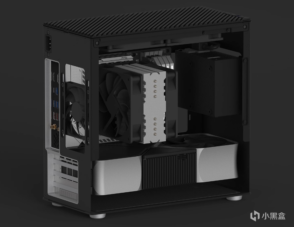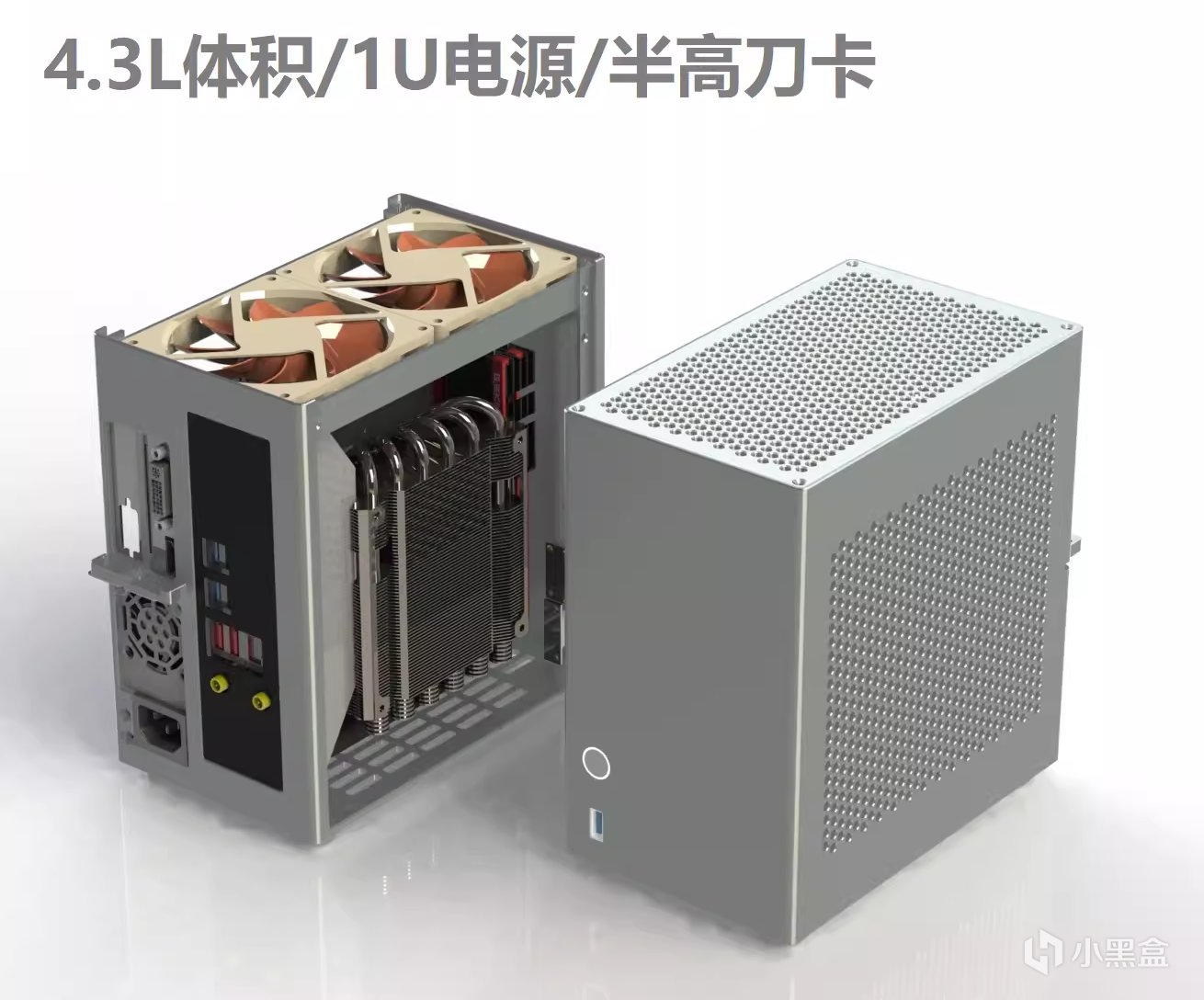 而背靠背式,是机箱内部至少被分割成两个相对独立的空间,一侧安装桌边,另一侧安装显卡,显卡与主板是背靠背的。这种设计的好处是,可以在10L甚至更小的空间里,安装上4080、4090这种档次的显卡。目前市面上相当多的ITX机箱都采用这种结构,特别是一些非量产的定制产品。但由于机箱厚度本身只有10多CM,厚度被看了一半,所以CPU散热器高度被限制的很死,一般都不会超过70mm,如果用风冷只能选择一些超薄风冷散热器。如果想上高端CPU,基本只能选择水冷散热。