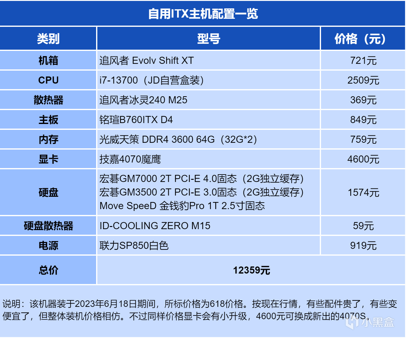 虽然已经过去半年多的时间,但现在装机的话,里面只是个别配件需要调整,比如CPU可以换成14700K,比如显卡可以升级成4070S,主板的话我可以考虑换成ROG B760ITX,内存换成DDR5,但其他方面差不多。但今年的固态硬盘,可是比去年涨价了。