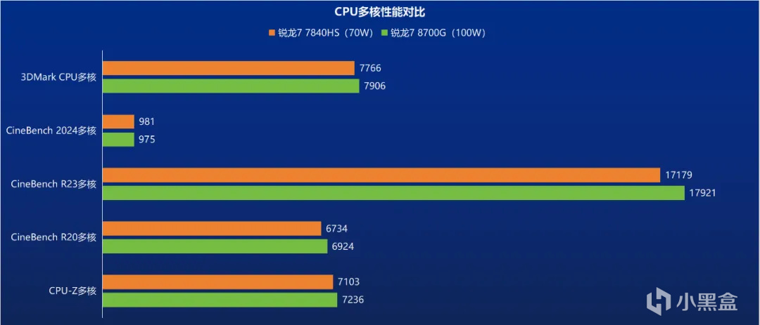 但是吧,这个8700G实际就是移动平台7840HS的高功耗版,一个设计TDP 54W,一个65W。两者都是8核16线程,核心、缓存等参数完全一致,最高主频都是5.1GHz,只是8700G的基准主频从3.8GHz提高到了4.2GHz而已。如果7840HS给足了散热和供电,其性能和8700G应该是一致的。这不是猜测,而是经过实际测试的,两者想能几乎就是一样的,只是一般来说台式机供电散热有一些优势,所以8700G有略微的性能优势。但迷你主机中,7840HS有一些主机加强了散热,功率释放可以达到70W,这种情况下7840HS和8700G的性能就几乎相同了。