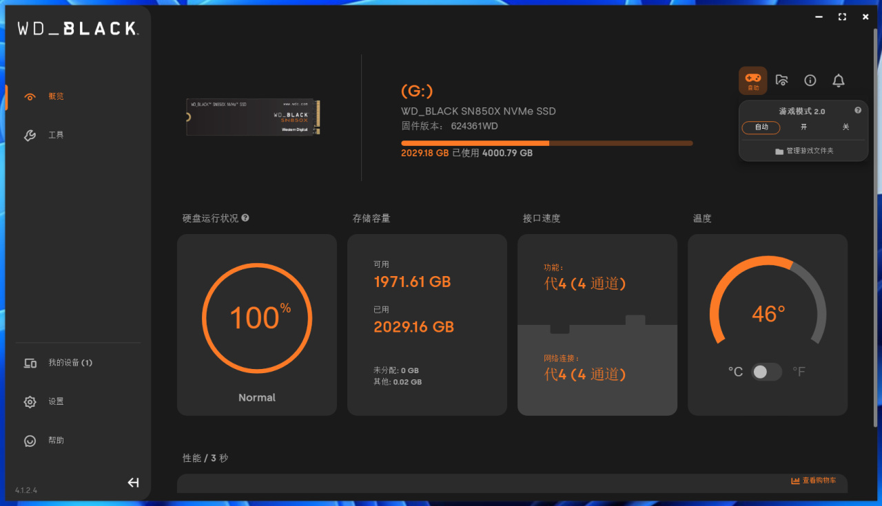 西部数据还有一个Dashboard软件,现在更新的Game Mode 2.0 功能,增加了游戏模式里的“自动”选项,就能自动触发机制检测到用户在进行游戏时,提前将数据读入缓存来降低游戏的加载时间。