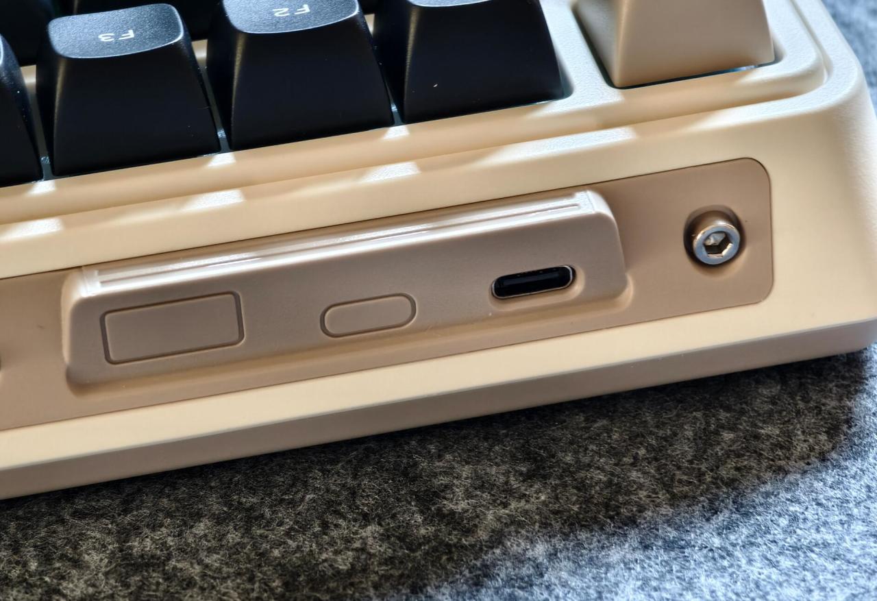 前方则是做了凸出设计用以作为插线口,还可以看到封上的两个口。依旧是k75系列的经典金属钉+拼色设计,给键盘的额头添色不少。