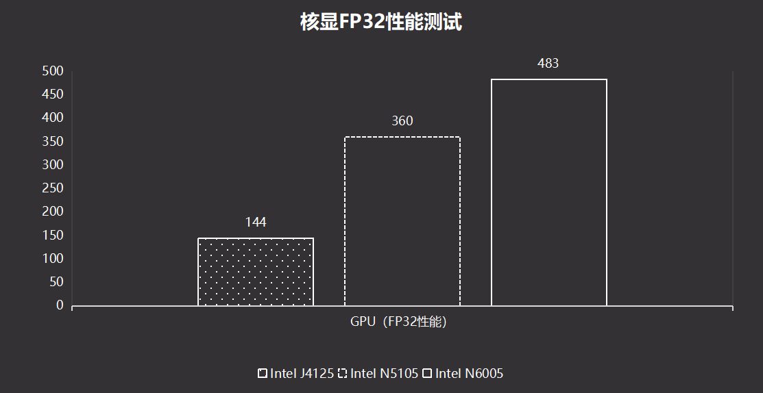 最后是显卡单精度浮点性能(FP32)测试,越高代表显卡性能越强。相比较N5105,Intel N6005集显性能提升33%;相比较与J4125,Intel N6005集显性能提升至335%。集显性能提升过于恐怖了!