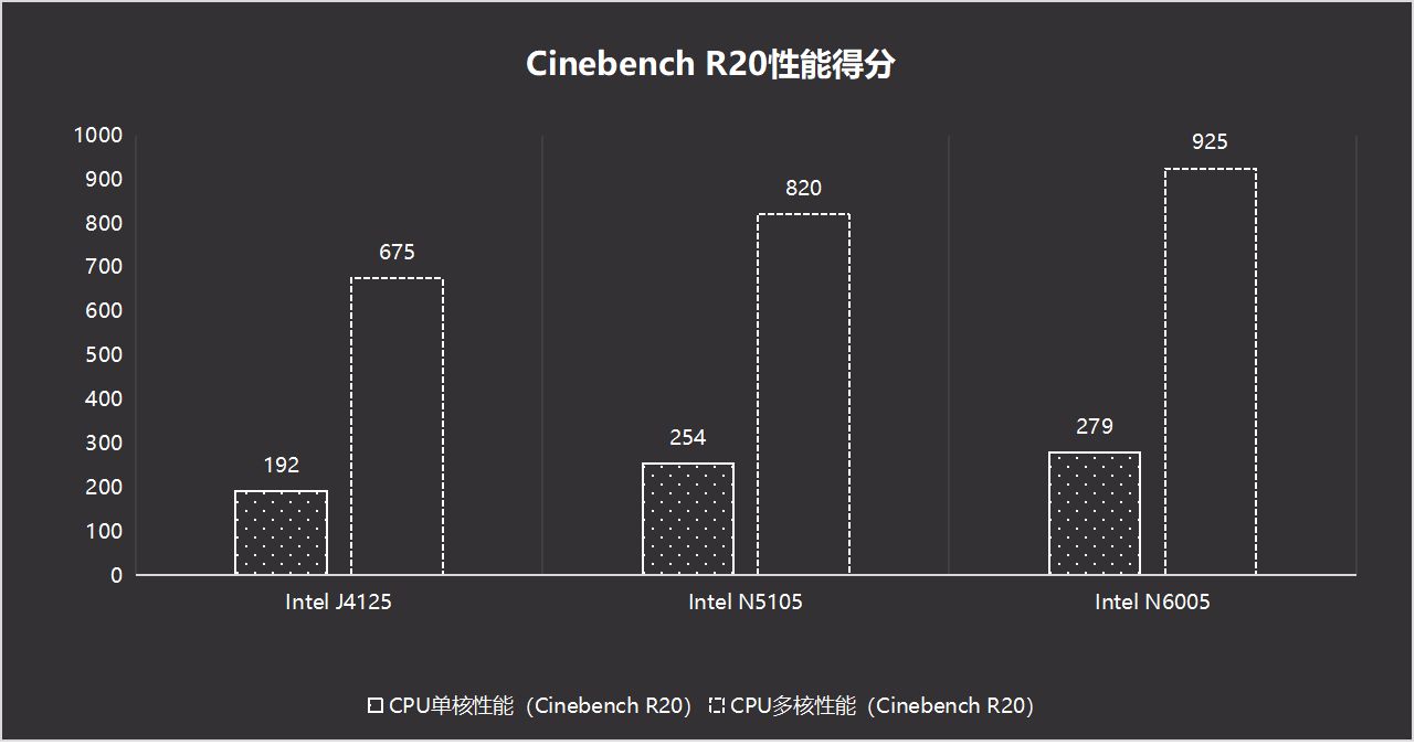 首先是Cinebench R20测试,这是一个CPU性能测试工具,可以看到威联通TS-466C采用Intel N6005处理器是所有里面最强的。相比较N5105,多核性能提升13%,单核提升10%;相比较与J4125,多核性能提升37%,单核性能提升45%。