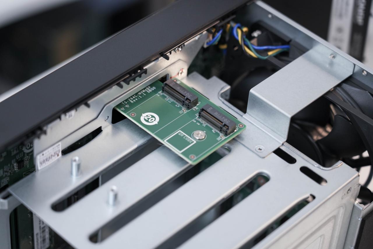 拆开威联通TS-466C,就可以看到2条M.2 2280 PCIe Gen 3.0 SSD插槽,这个插槽是支持速率是3000MB/s的读写速度,意味着在机内传输的速度可以达到很快,但是如果是局域网访问那还是会受限于网口速率,SMB多通道访问以及链路聚合最高是5Gbps,也就是640MB/s,这个速度也足够家庭用户以及小型办公团队使用了。