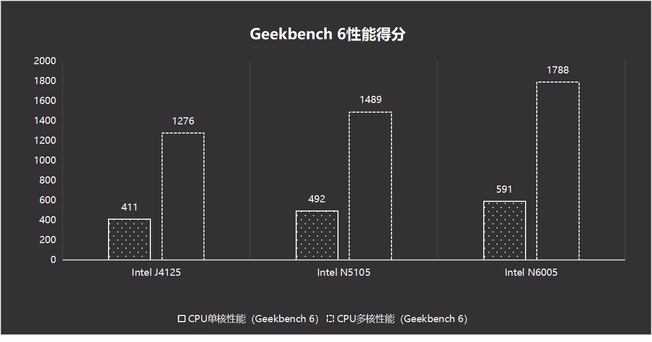 接着还是Geekbench 6测试,这是一个CPU性能测试工具,可以看到:相比较N5105,Intel N6005多核性能提升20%,单核提升20%;相比较与J4125,Intel N6005多核性能提升48%,单核性能提升44%。