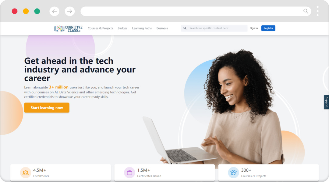 Cognitive Class 是一个提供免费数据科学、人工智能、云计算等课程的网站。它提供了许多有关区块链、数据科学、人工智能 等领域的前沿技术课程。完成课程学习还会获得证书和徽章。此外,Cognitive Class 还提供了一些有趣的学习路径,例如《AI 基础》、《机器学习基础》、《PyTorch 实战 AI》等。