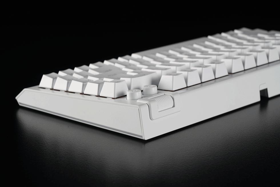 键盘顶部采用了一体成型的5052铝合金材质顶盖,表面经过电泳工艺处理质感光滑细腻。键位布局上提供了F区、方向键以及部分功能键,并支持组合键调用常用功能键,进一步保证了玩家的输入体验不受影响。