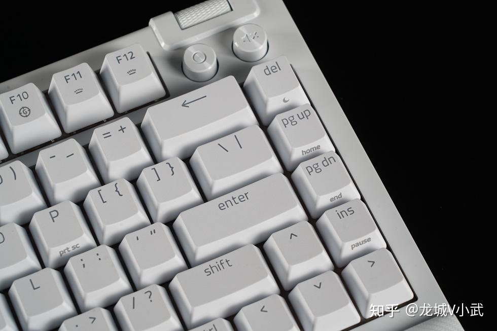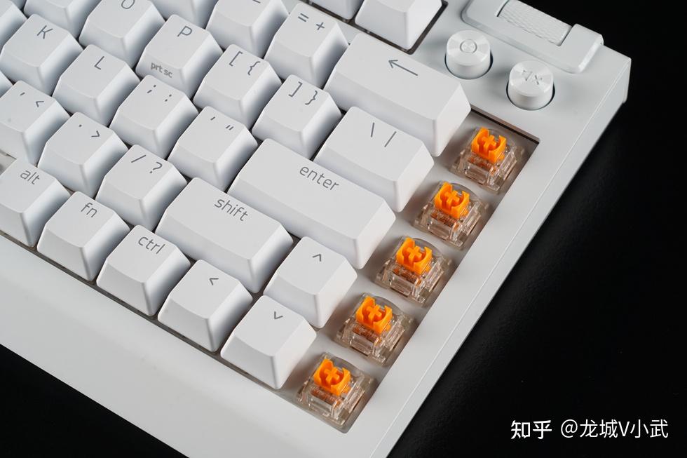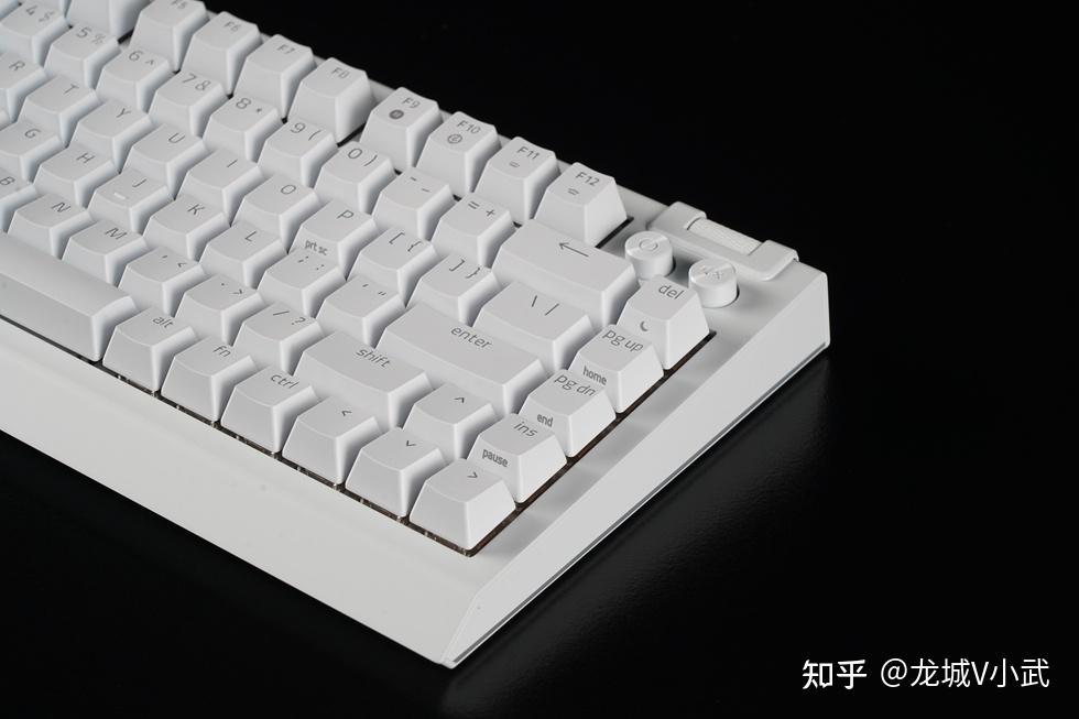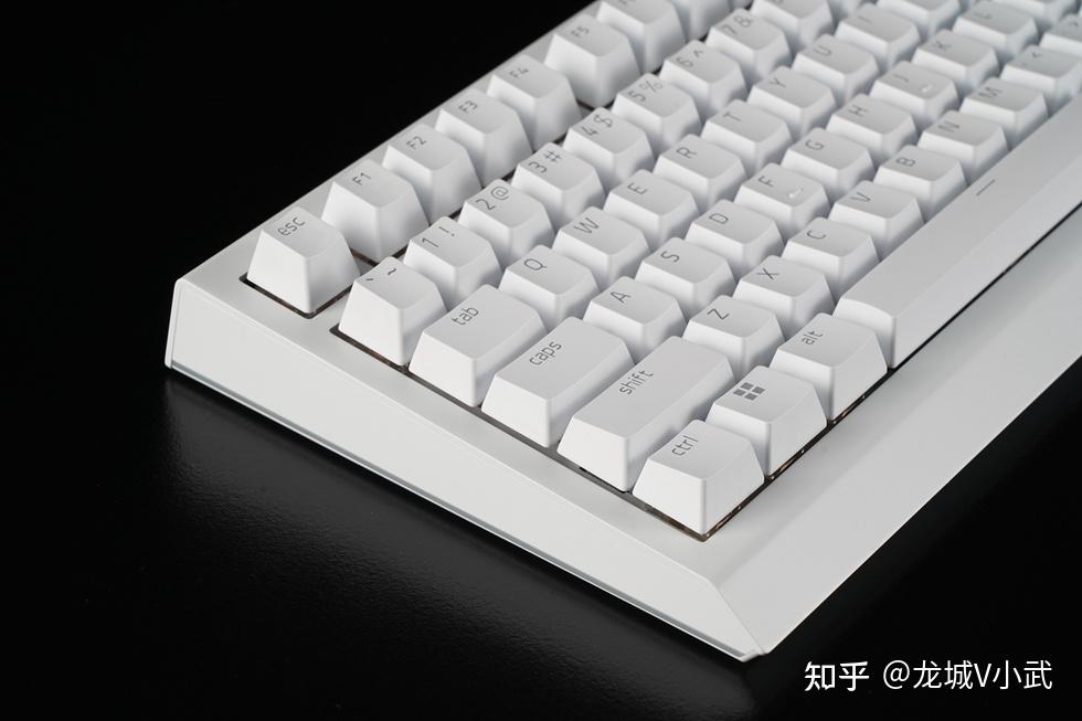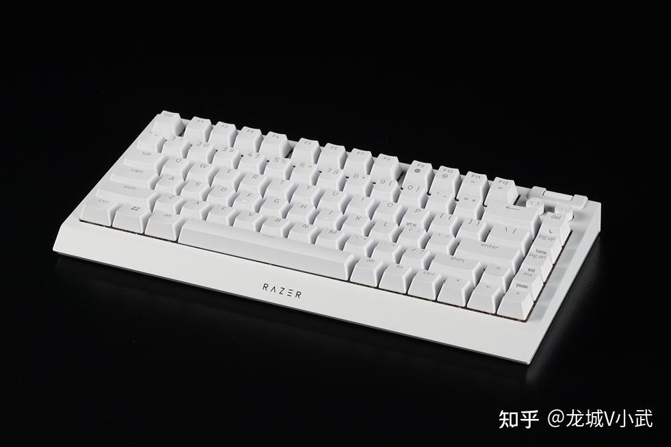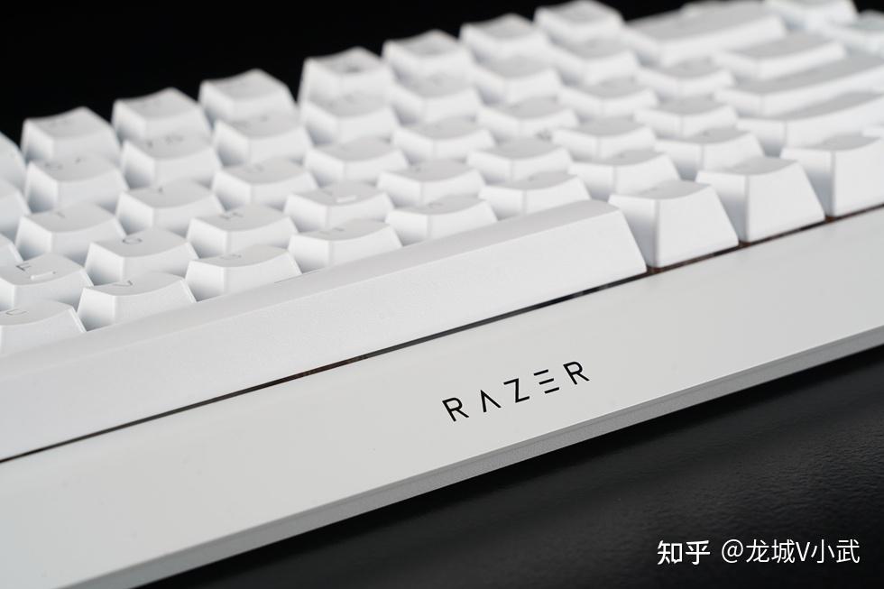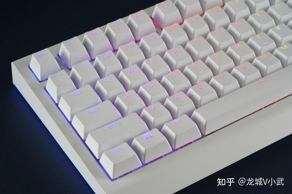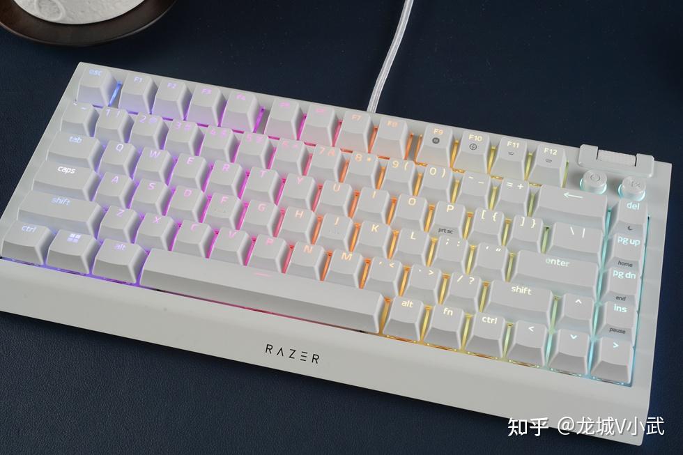 手头这把雷蛇黑寡妇蜘蛛 V4 75% 白色版本搭配的轴体为雷蛇第三代触感橙轴,这款轴体触发压力为50g,键程3.5mm,触发行程2.0mm,按键寿命更是达到了约1亿次。匹配的键帽为双色注塑的ABS键帽,OEM高度,闭口字符透光方案。键帽表层带有类似PBT材质的磨砂质感,配合双色工艺处理,在耐用性与抗打油表现上也要更好一些。