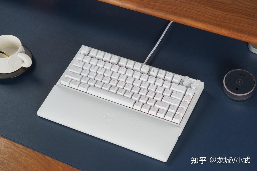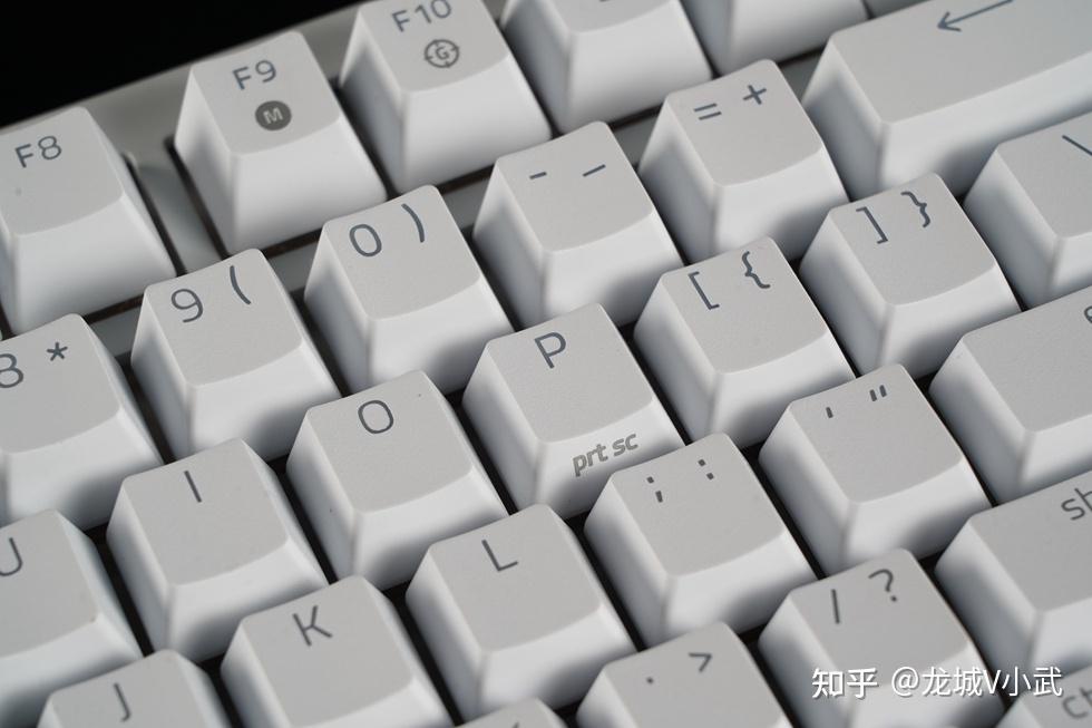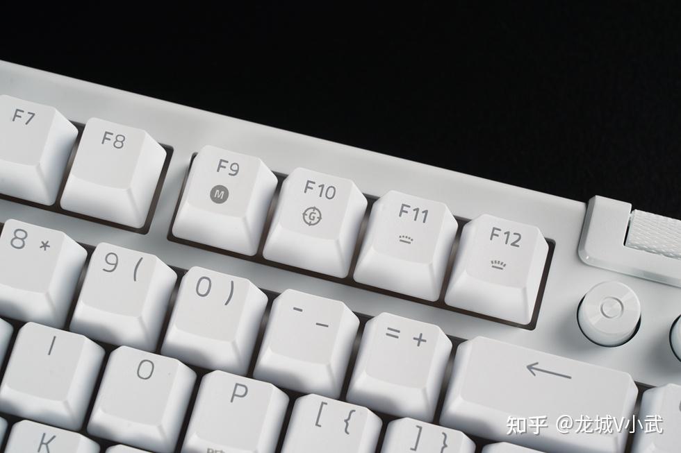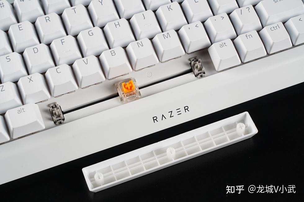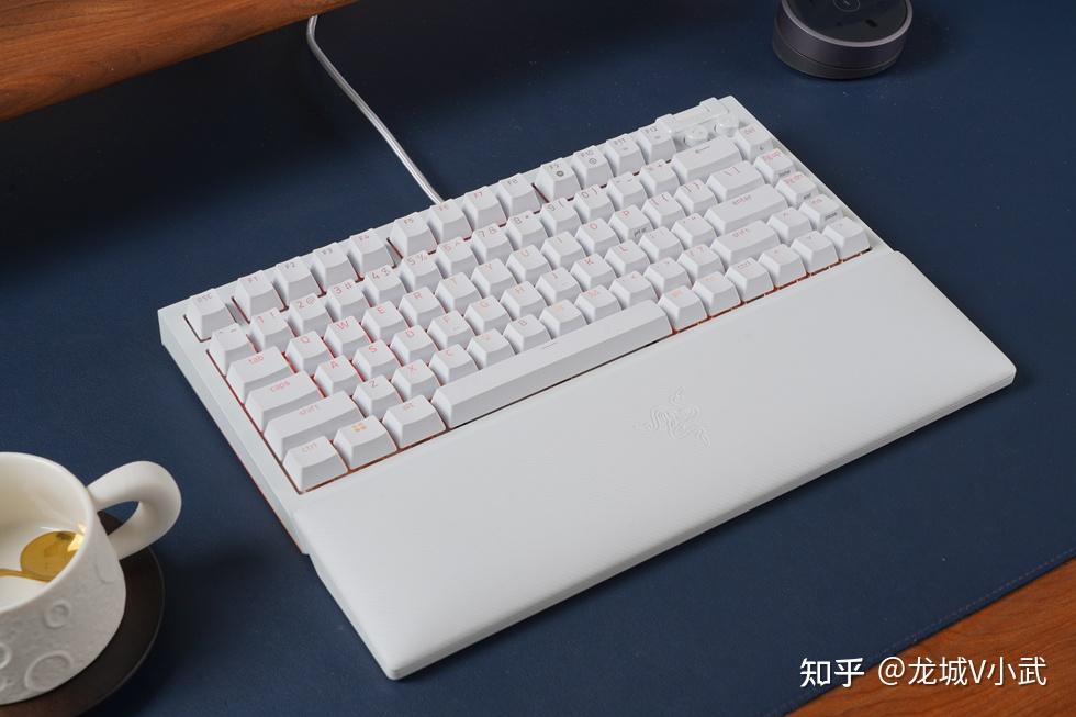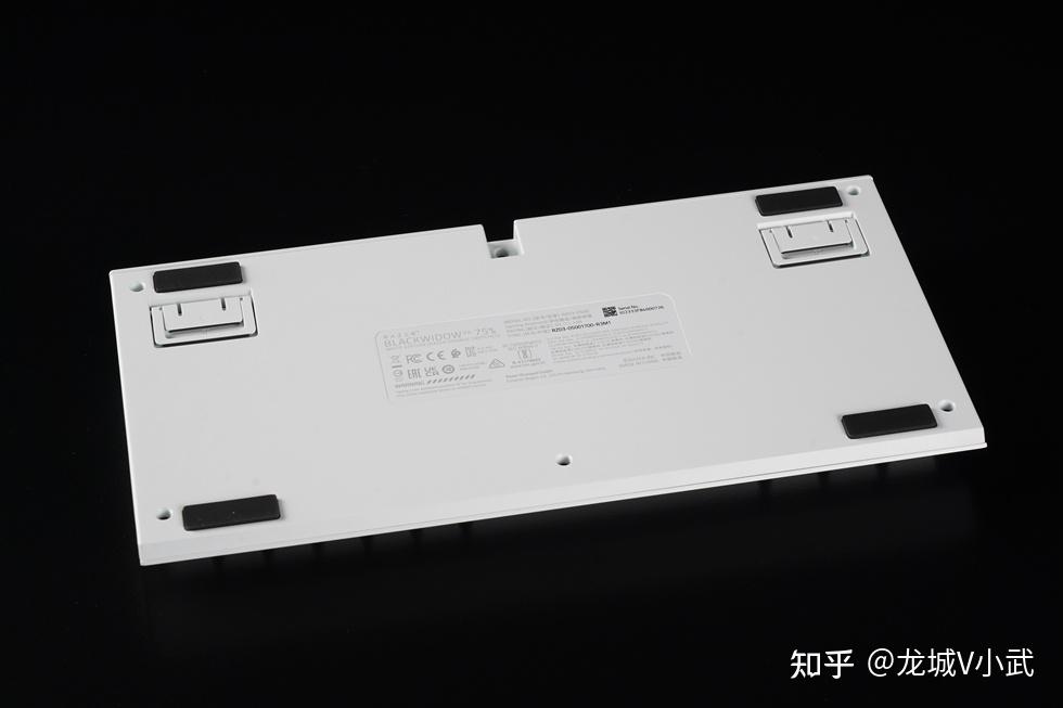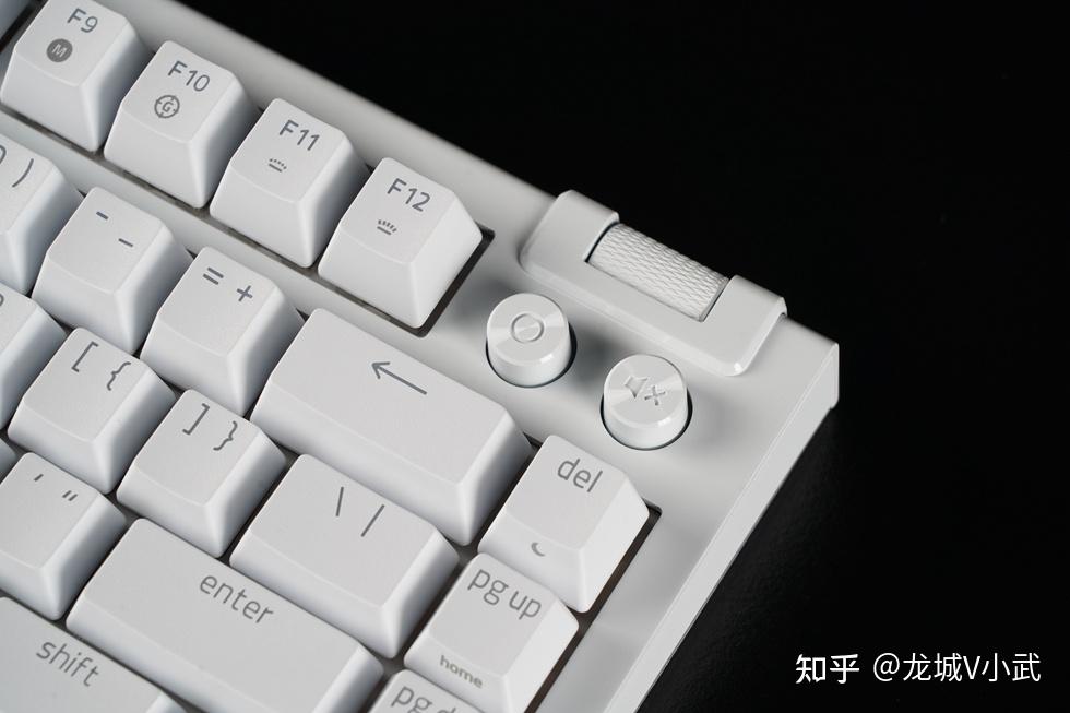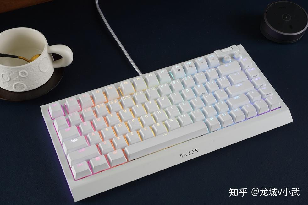 手头这把雷蛇黑寡妇蜘蛛 V4 75% 白色版本搭配的轴体为雷蛇第三代触感橙轴,这款轴体触发压力为50g,键程3.5mm,触发行程2.0mm,按键寿命更是达到了约1亿次。匹配的键帽为双色注塑的ABS键帽,OEM高度,闭口字符透光方案。键帽表层带有类似PBT材质的磨砂质感,配合双色工艺处理,在耐用性与抗打油表现上也要更好一些。