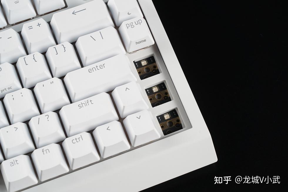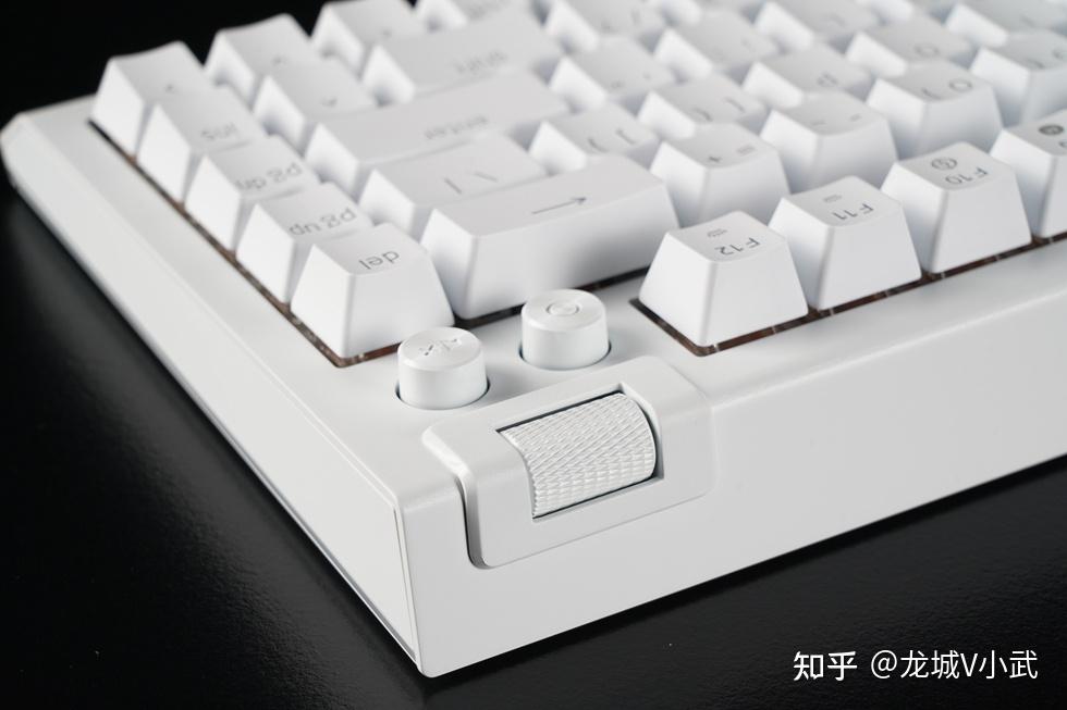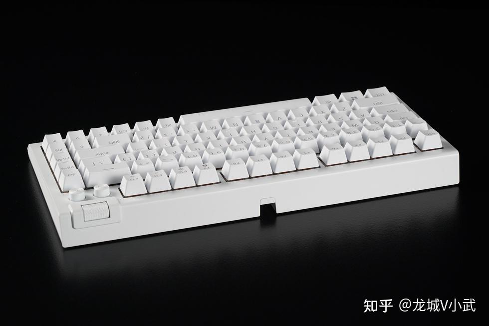 接下来是键盘本体:整体纯白设计,布局方面采用了时下很火的75%配列,保留了F系列的功能键并搭配多媒体旋钮方案。键盘整体尺寸为:321mm*240mm*24mm,重量为986克,整体小巧便携。
