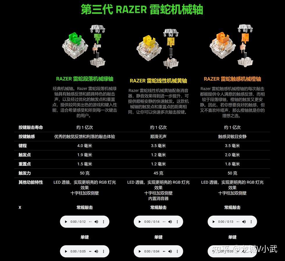 再来看轴体部分,官方提供了三种手感的轴体可供玩家选择,每款轴体的特性以及实际敲打声音都可以去预先了解和体验。玩家可以根据自己的喜好在不同的区域或者键位更换不同触发压力的轴体,以实现同一把键盘不同按键的差异化手感。