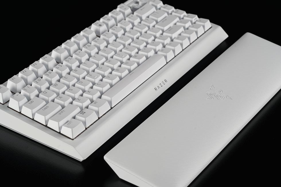 单独附赠了一个人造皮革材质的键盘手托,内部填充有记忆海绵质地柔软舒适,长时间码字或者游戏对手腕很好的支撑不会感到疲劳。手托皮革表面有着类碳纤维材质的纹理,中心部分还有雷蛇的经典Logo。