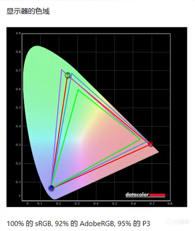 通过红蜘蛛检测,检测出来100%sRGB以及92%AdobeRGB和宣传的是一样的,甚至在sRGB方面甚至还超过了宣传说的,能达到了100%这个色彩准度平时打游戏什么的,完全足够,满足绝大部分人对于打游戏的需求