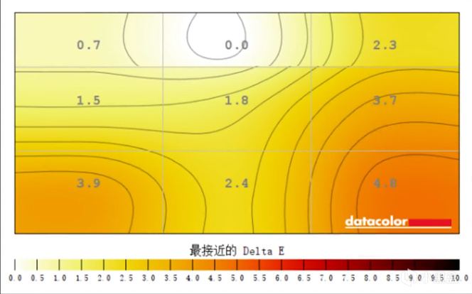 在亮度均匀性方面IPS面板的漏光情况这里还是存在,主要是集中在右下角最大偏差在4.8