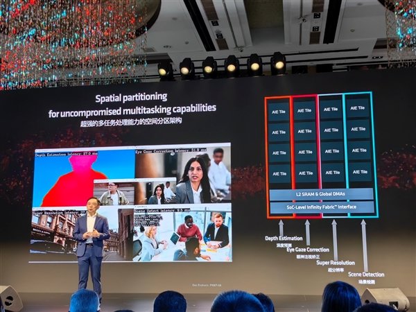 更令人期待的是,AMD的XDNA AI引擎架构拥有一个独特优势——空间分区,可以并行执行多任务,互不干扰,也不会损失性能和效率。比如,你可以利用这种AI引擎,同时执行深度预测、眼神矫正、超分辨率、场景检测等不同负载。