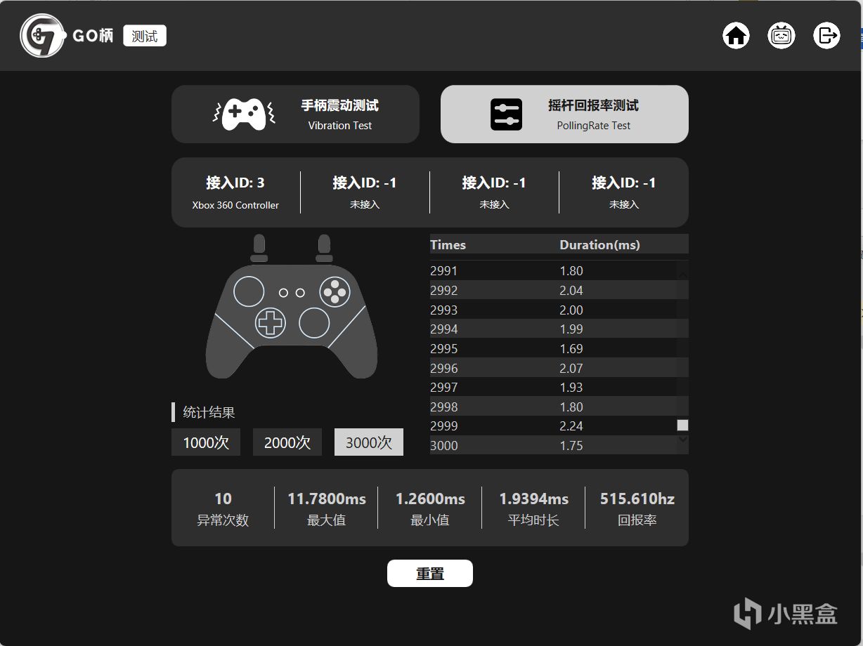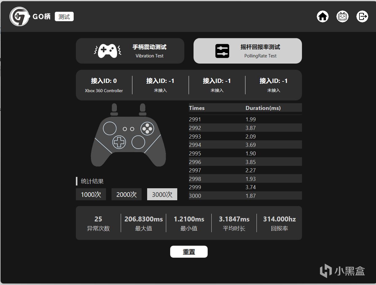 回报率测试中,在有线、蓝、2.4G接收器三个模式下分别进行测试,其中有线模式下回报率可达500hz,2.4G接收器模式下回报率有300hz以上,蓝牙模式下回报率为135hz左右。