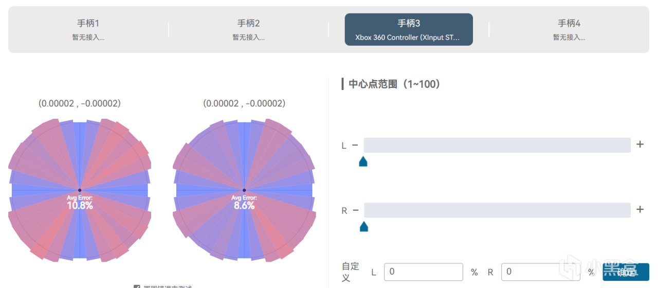 摇杆的画圈错误率大概在9%左右,默认存在一定的摇杆死区,可以通过飞智空间站对死区进行调节。