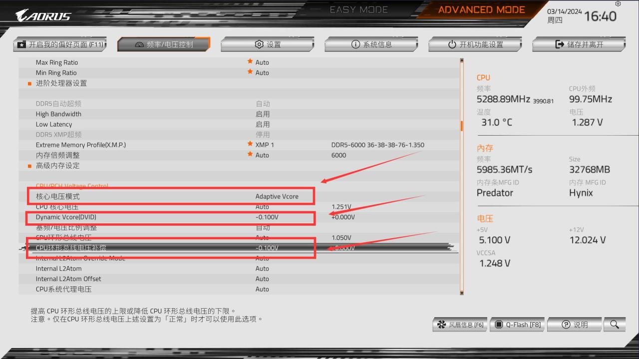 ● 第一是核心电压模式,默认是自动,修改为Adaptive Vcore模式。