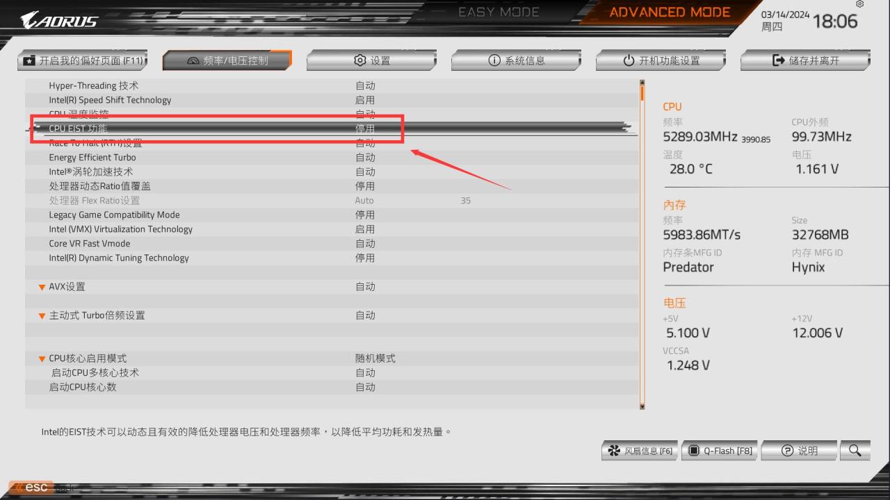 下面开始实操,首先进入高级模式的频率/电压控制页面,进入进阶处理器设置,找到下图的CPU EIST功能,切换成停用。