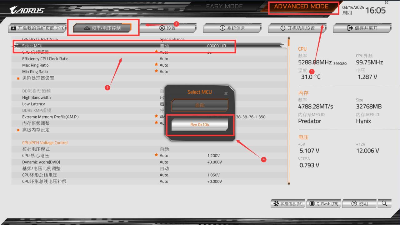 最后一步,点击高级模式中的频率/电压控制,看下图找到Select MCU,切换成Rev 0x104微码,之后选择储存并离开重启电脑。