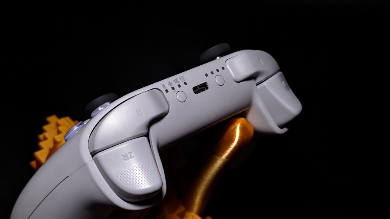 此外,手柄的充电口左边是模式切换按键,可以自由的多平台切换连接,左边是配对按键和电源提示灯