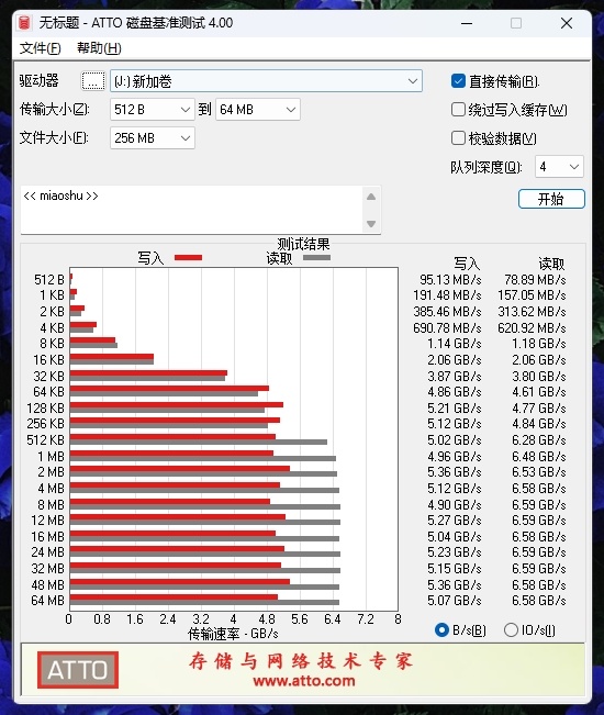 我们最后再使用ATTO磁盘基准测试,他能够很好地说明不同文件大小下对于SSD速度的影响,你可以看到在64KB时写入速度为4.86GB/秒,读取速度为4.61GB/每秒。从这开始他们的写入与读取速度都在5GB甚至6GB上下,十分稳定,性能表现没有什么问题。