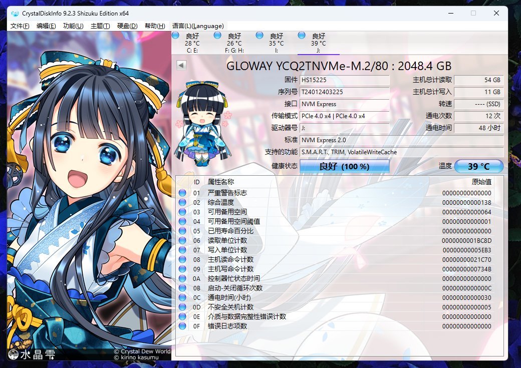 首先我们先使用diskinfo,我们选择需要检测的硬盘后你可以看到它的数据。这款硬盘是支持NVME EXPRESS2.0,温度方面为39度,如果你的硬盘是刚买回的话就可以用这个一起查一查硬盘的通电次数与通电时间了,如果次数和时间过多,那么懂的都懂