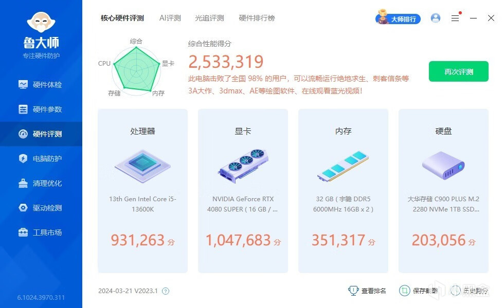 ▼简单的跑个整机测试,整机得分253W,其中处理器单独得分93.1W,其中显卡单独得分104.7W,分数很给力。