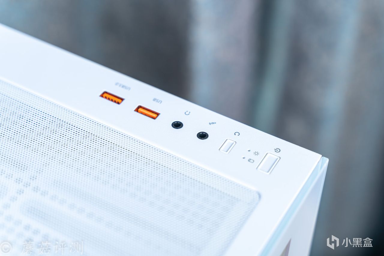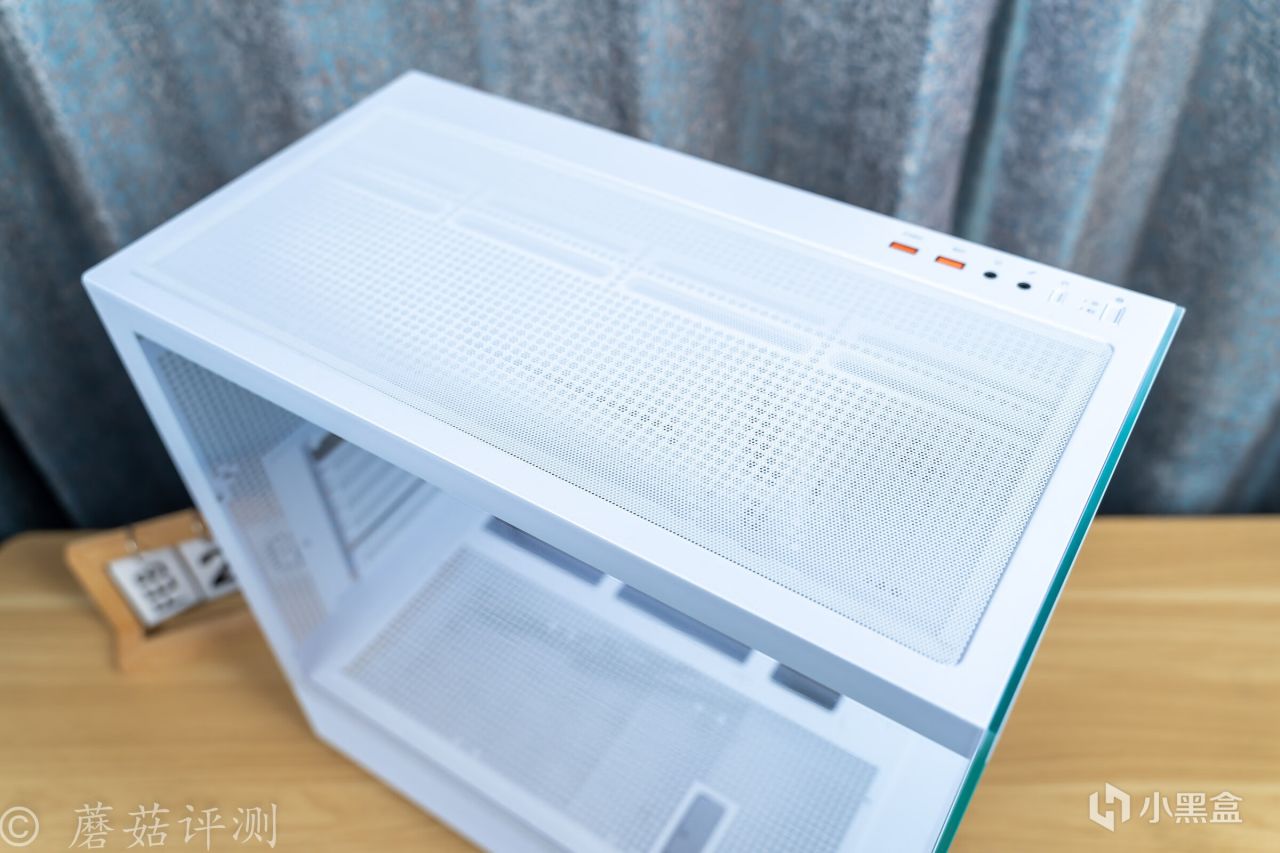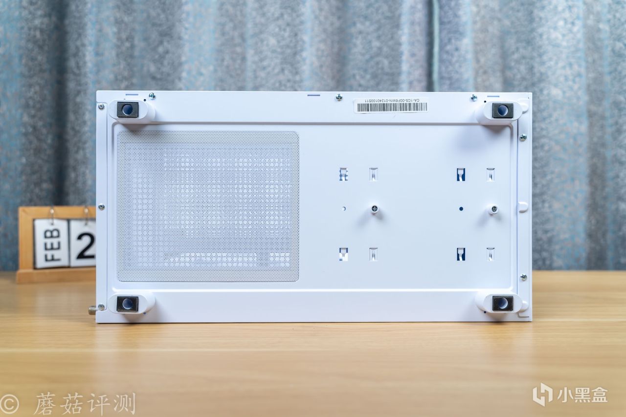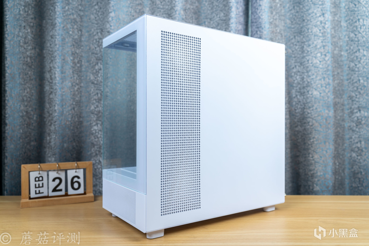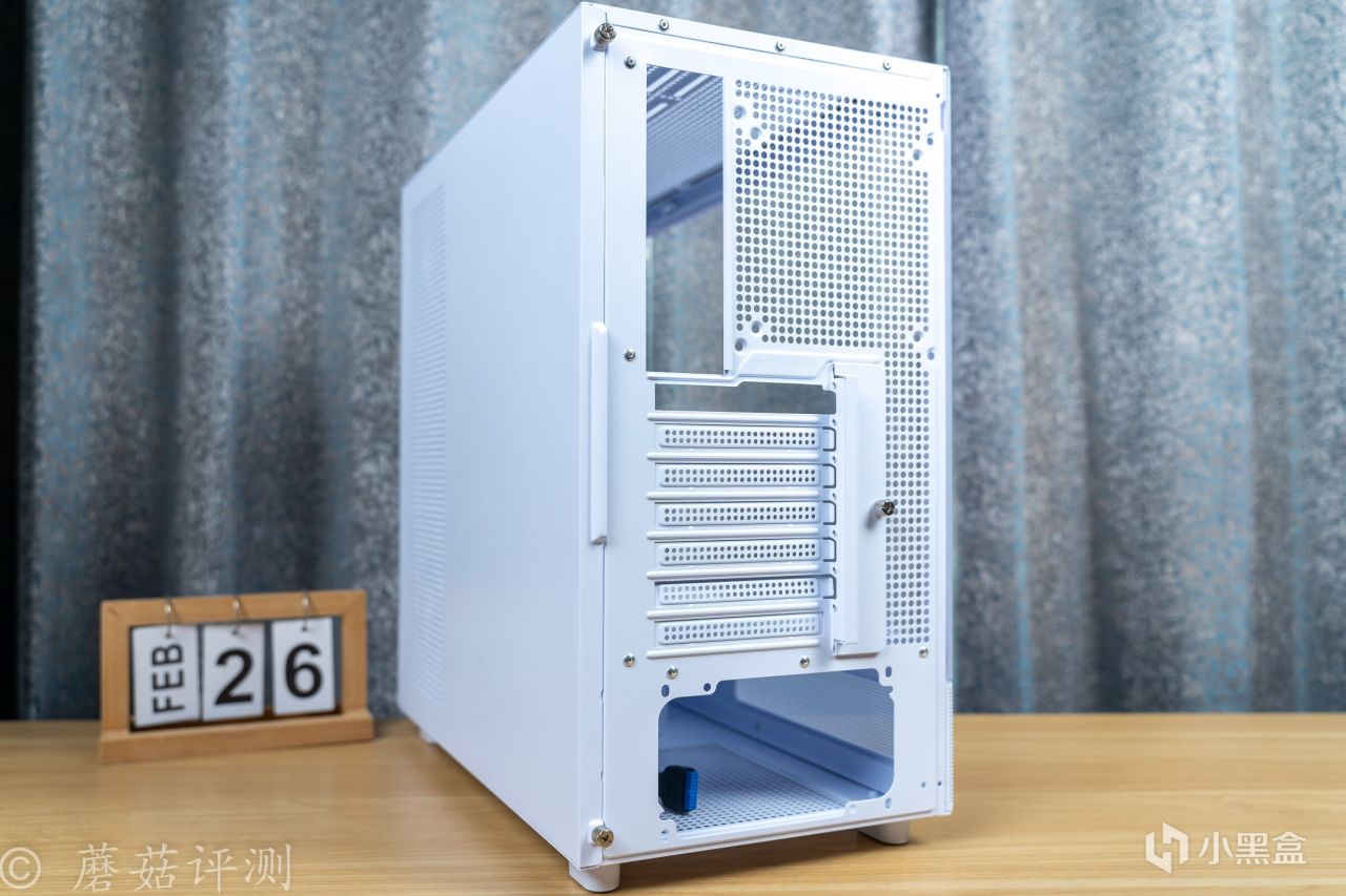 ▼机箱侧面,大面积的侧透玻璃,白透设计的,透光效果特别好,另外在机箱底部电源仓的侧面,是大面积的金属冲孔网。