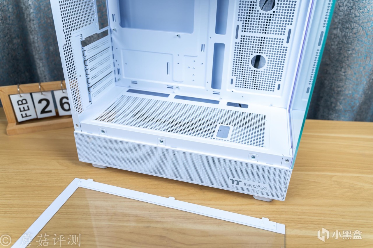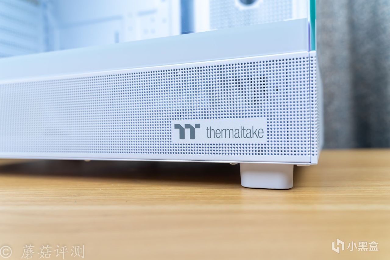 TT的这款钢影透S机箱的整体表现非常不错,性价比很高的一款海景房机箱。机箱的侧面和前侧,标配了大面积的玻璃侧透,在玻璃侧透占据了机箱侧面和前侧之后,这款机箱的设计师,选择把电源仓的侧板设计成金属冲孔网,从机箱的底部进风,并在电源仓的顶部设计有机箱风扇位,进一步加强这个机箱底部进风的风道,让机箱内部的散热表现依然保持在一个很高的水平。