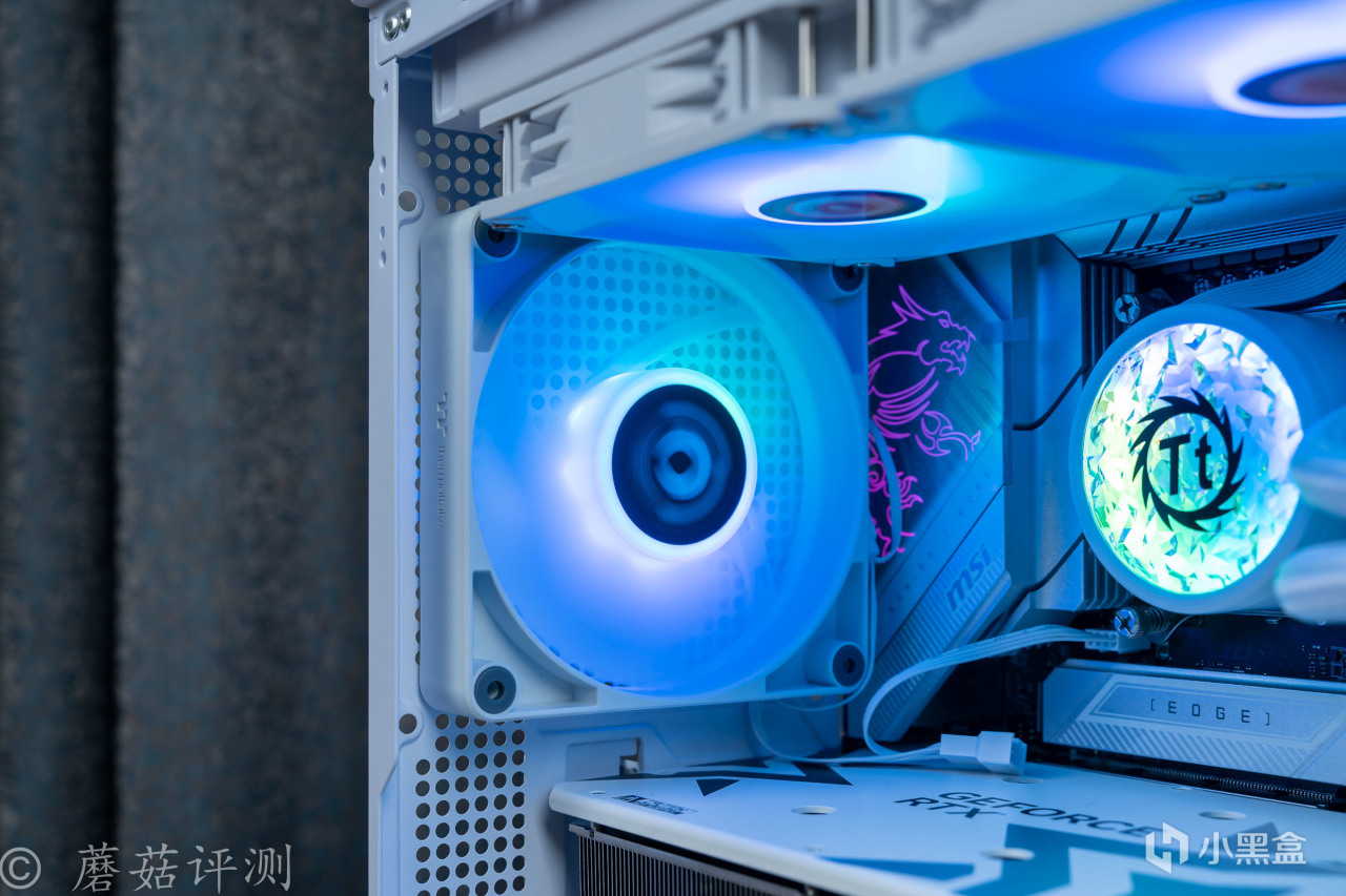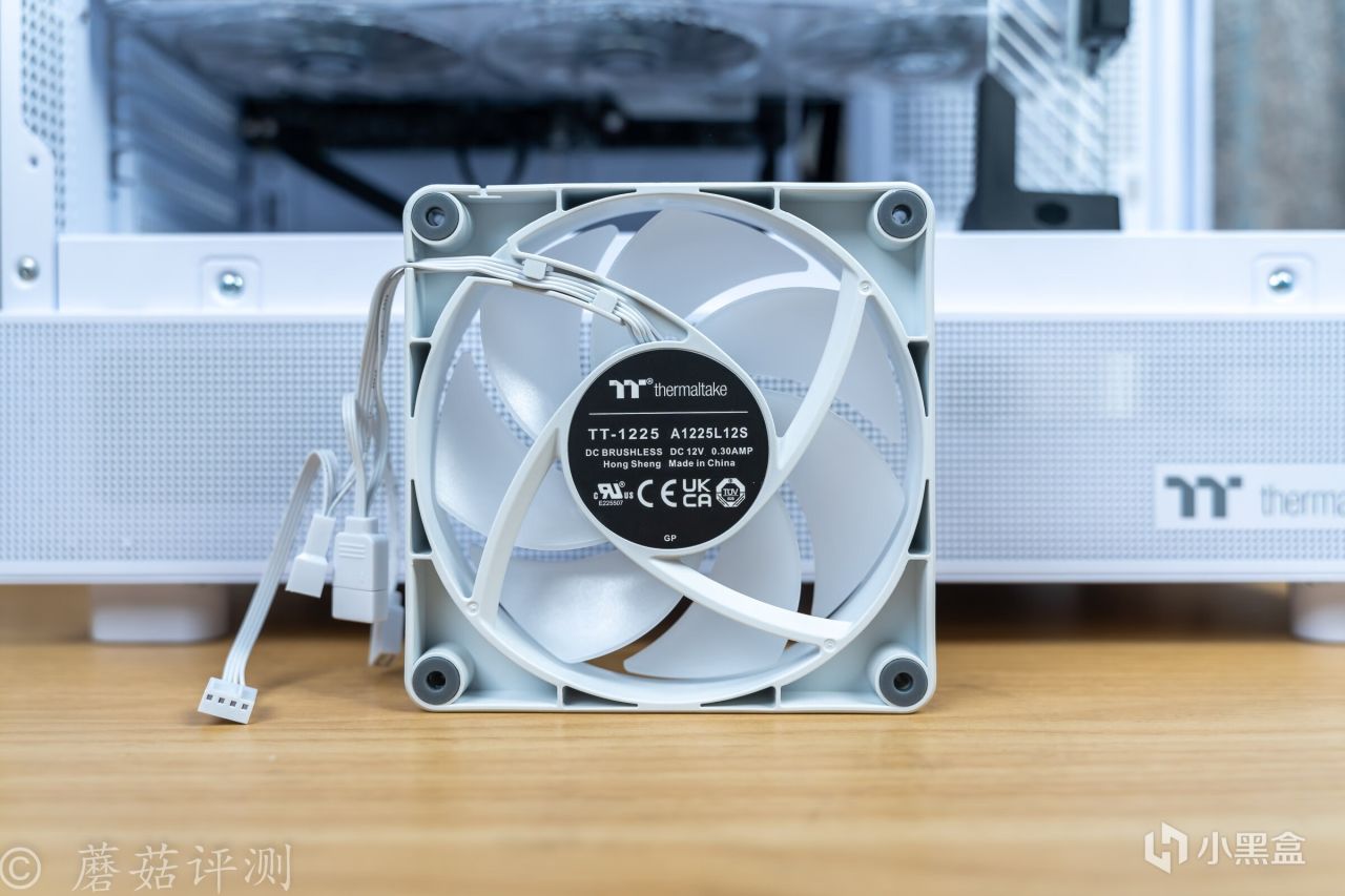 ▼最后把机箱风扇装好,用的是TT的CT120 ARGB WHITE,这款机箱风扇用料很不错,整体很扎实,运行很稳定,四角有四个橡胶垫,减震效果很好。