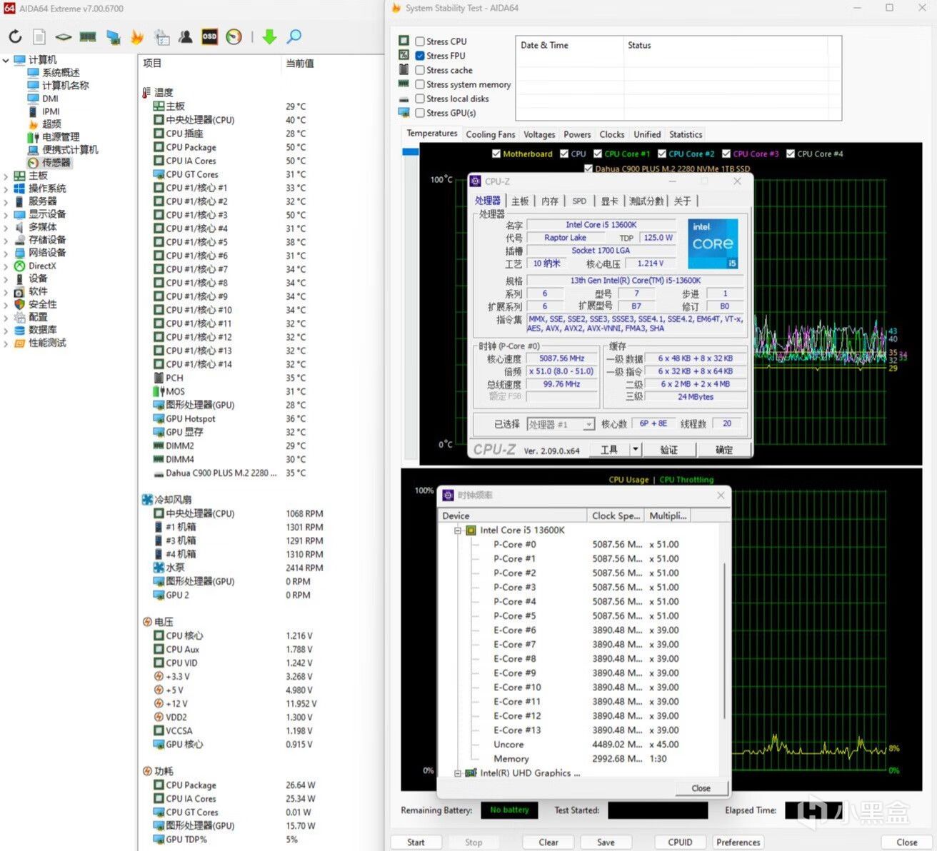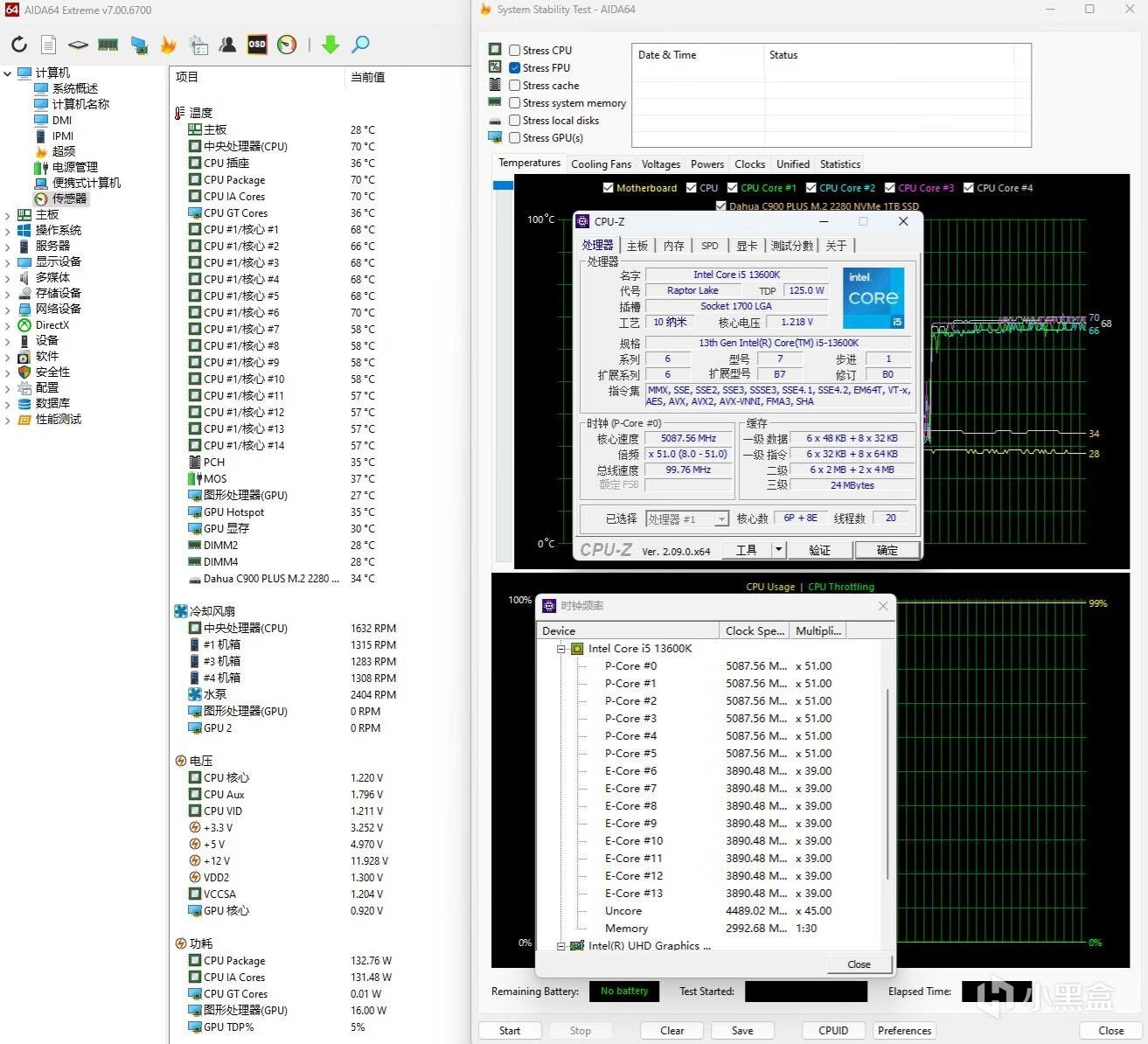 ▼简单跑个CPU-Z的压力测试,处理器功耗在135W左右,温度在70℃左右,南桥35℃,供电37℃,显卡核心27℃,固态34℃。