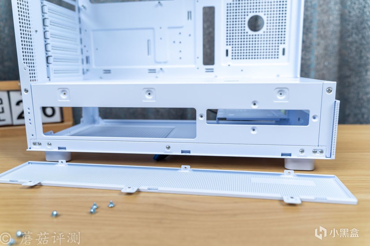 ▼机箱底部,四角是四个硕大的防滑泡棉,左侧电源仓的底部也标配有磁吸式的防尘网,右侧是硬盘仓的固定位,有两个档位。