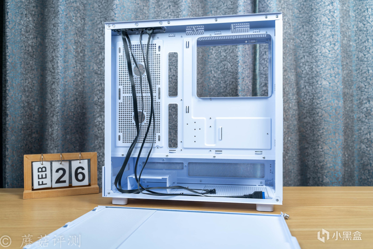 ▼机箱侧面的侧透玻璃采用卡扣设计,玻璃的三边有包边设计,可以保护侧透玻璃。机箱内部,左侧是主板固定位,四周有走线开孔,右侧有两个机箱风扇位。