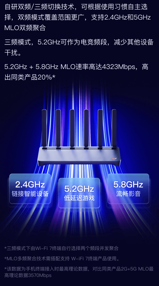 据介绍,这款路由器采用 Wi-Fi 7,搭载 MLO 多频聚合技术,多频并发 6453 Mbps,同时拥有“自研三频切换技术”,号称能够降低 20% 时延。