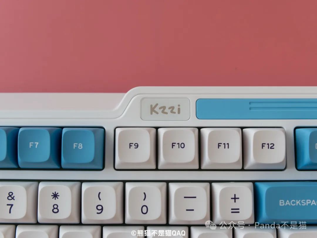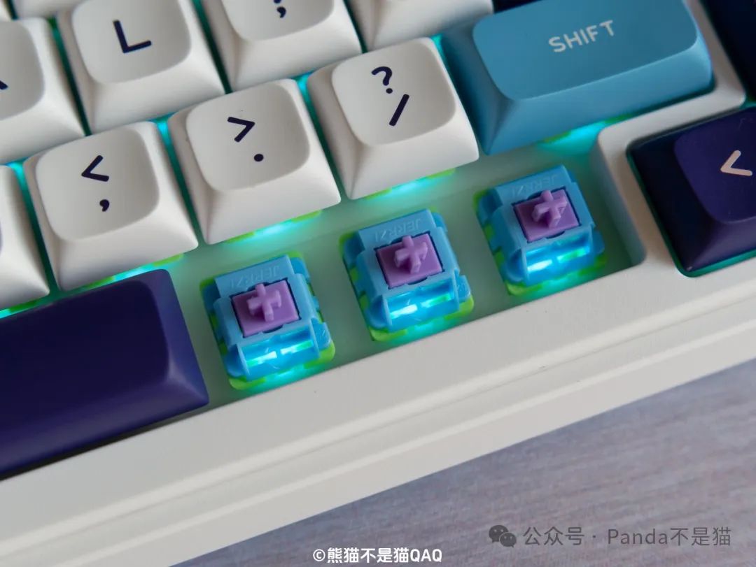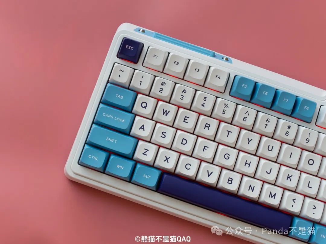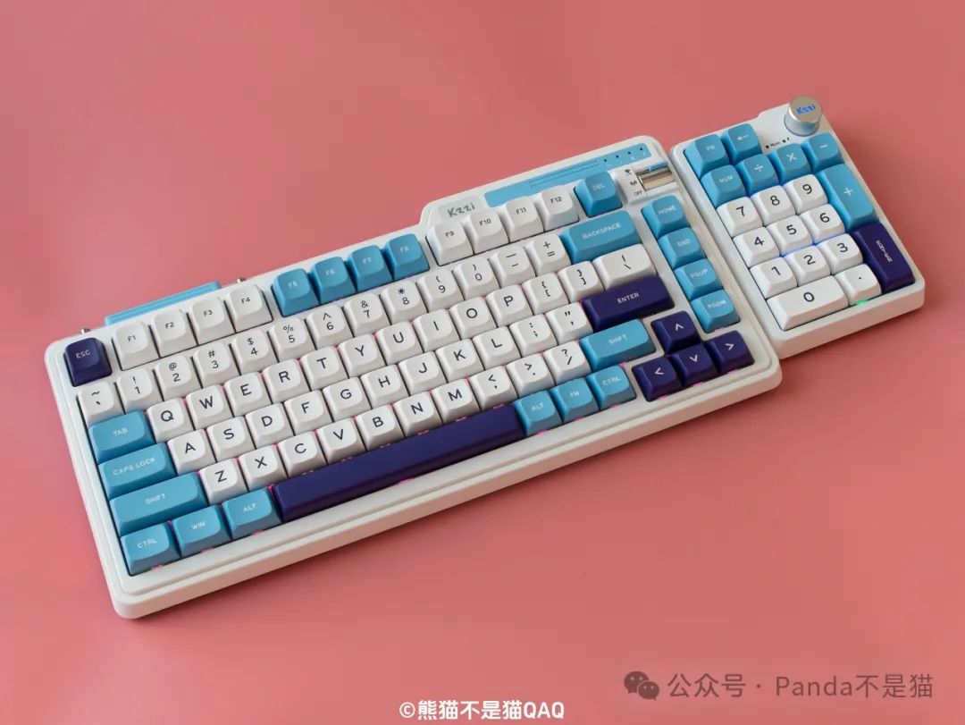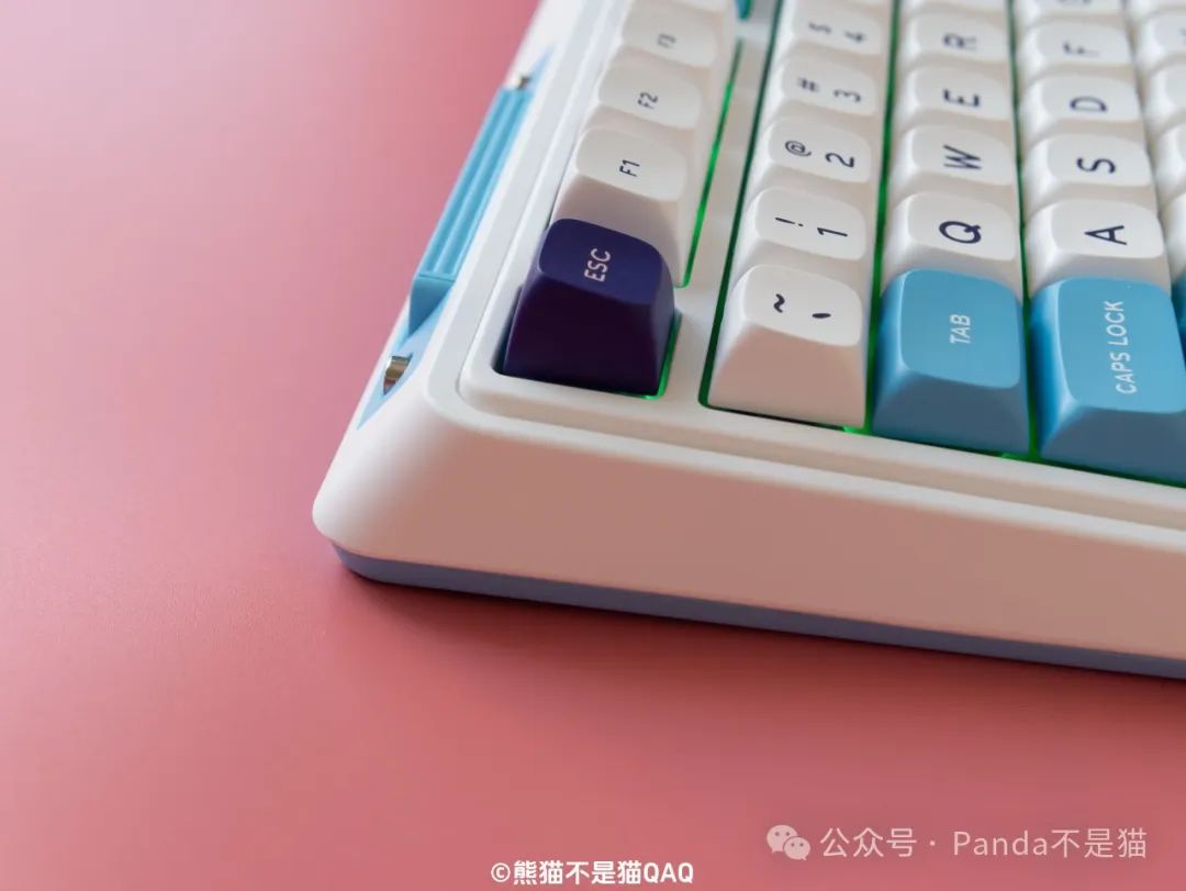 首先看k75lite的外观,整体为蓝白紫的三色拼接,其中顶端有蓝色的装饰条以及小设计的C接口区域。第一感官还不错,蓝白占主体有一种清新感,紫色点缀搭配又赋予了键盘优雅。这个配色你们会打几分呢?