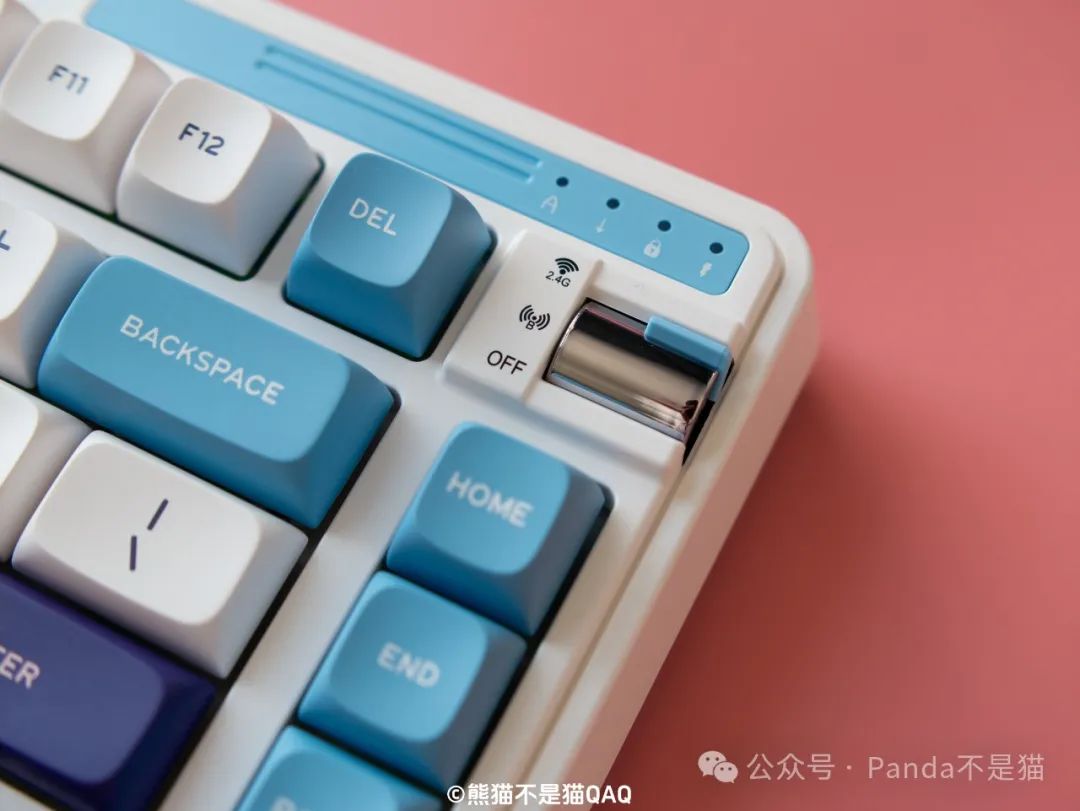 在拨杆的上方有一块凸起的区域,除了展示品牌logo,还嵌入了四盏状态指示灯,它们负责显示键盘的当前状态,如大小写锁定、电量等关键信息。不过我个人觉得,指示灯的这一块凸起部分其实可以在优化缩小体积,使其更为精巧,更有助于节省宝贵的桌面空间。