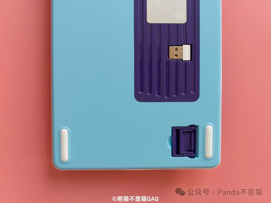 k75lite的接收器放置区被放在了背面,收纳区带有一定的磁吸,可以避免接收器掉落。同时键盘背面设有两段式的脚撑,可以根据自己使用习惯调节。
