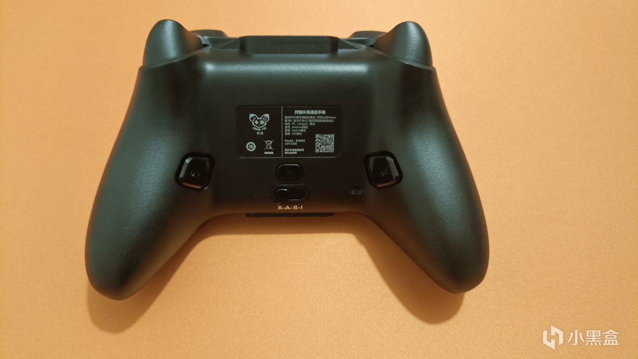 手柄背面做了防滑处理,仔细看可以看到细密的防滑纹路,扳机处也同样做了防滑处理,我这汗手实测不起眼的防滑设计还挺有效果的。手柄背面除了有铭牌以外,还有一个功能键、切换平台的拨杆可以切换PC/安卓/NS/IOS等多种平台。背面两侧还有两个可自定义宏的按键,不过没做防滑处理。截图键和”-”、“+”则做到了手柄下方。
