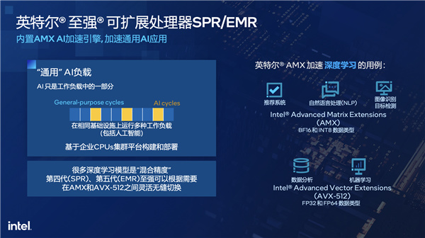 事实上,AI只是工作负载的一部分,更多的是通用负载,很多深度学习模型也都是“混合精度”,四代、五代至强运行它们的时候都可以根据需要在AMX、AVX-512之间灵活无缝切换。
