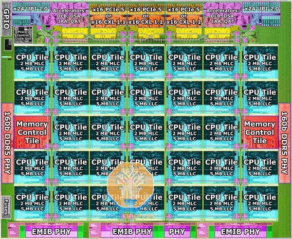 左右两侧是DDR5内存控制器,上方是PCIe、UIPI控制器,以及DLB、DSA、IAA、QAT等各种加速器,底部则是EMIB封装和通信模块,用于双芯片内部高效互连。