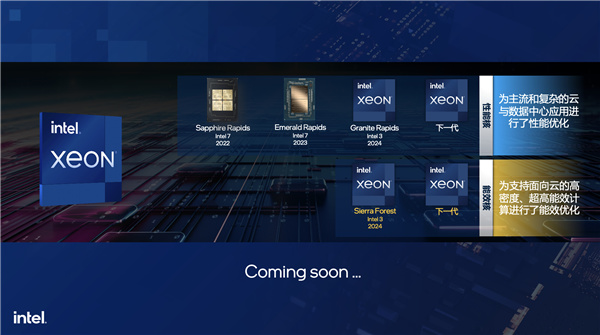 其中,Sierra Forest首次采用E核架构,单芯片最多144核心,双芯整合封装能做到288核心,今年上半年就能问世。