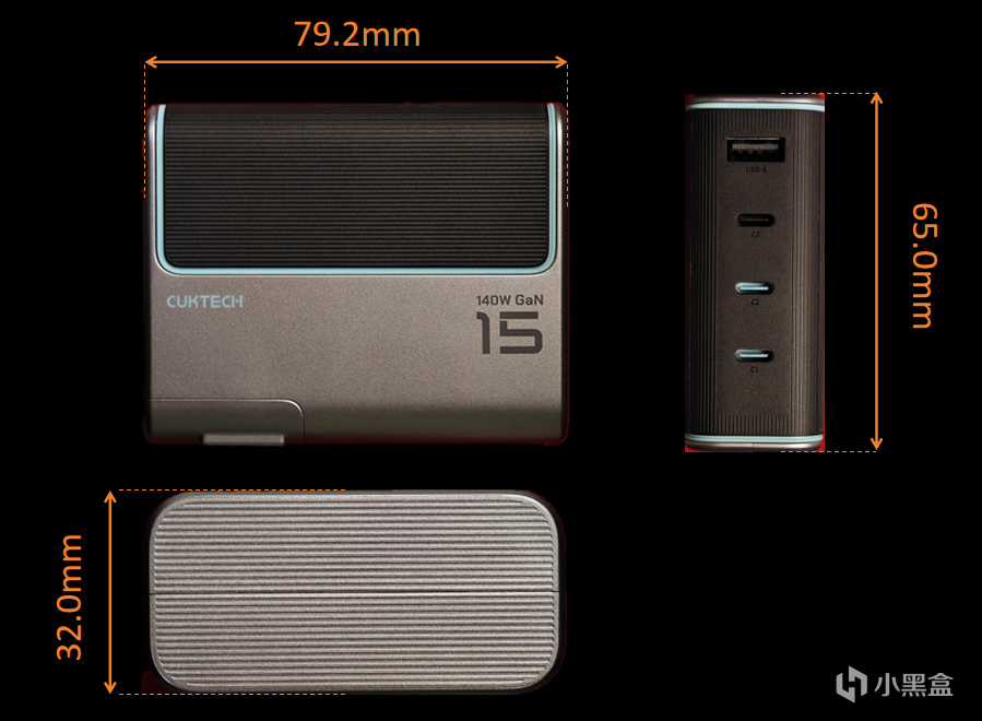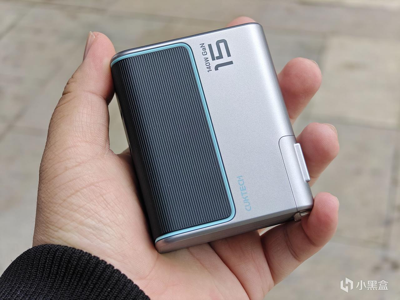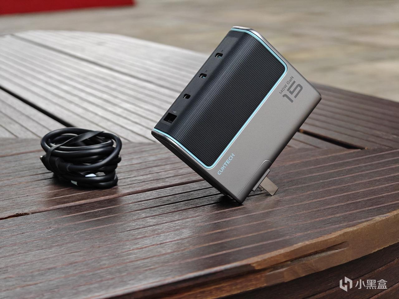 15号充电器也遵循酷态科的家族设计语言,都是钛灰色金属质感的喷漆+黑色格栅工程塑料的防滑纹理。这细节,好文明。