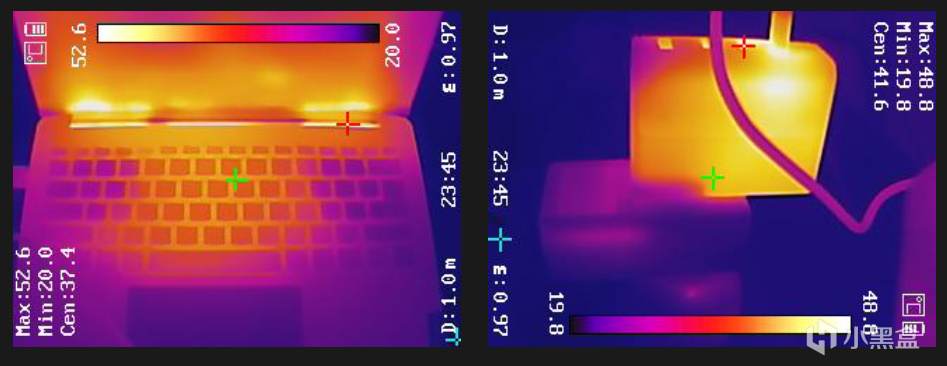 给大伙看下热成像,室温21℃,充电头最高温度48.8摄氏度,在充电口附近。温度不算高,还好。