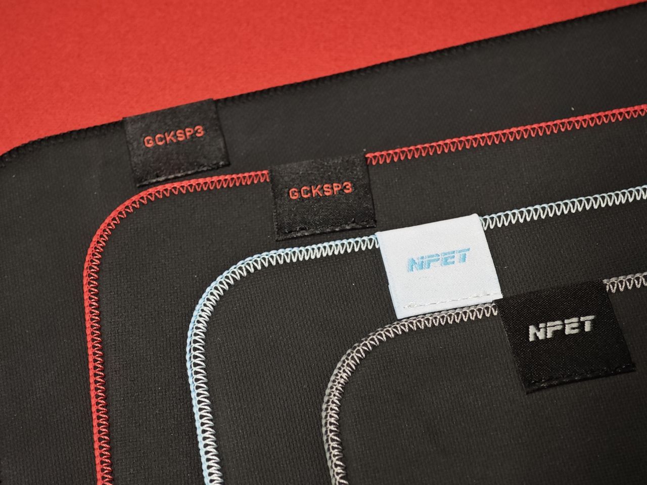 GCK4、GCKSP3、GCKSR1这三款鼠标垫的右上角缝了一个小带子,正面是NPET的LOGO,反面是随机的“NPET”的名字和产品的名字。正面的logo颜色搭配没什么问题,但是背面的LOGO图案是随机的,设计的不好,应该默认为鼠标垫的名字更加有区分度。