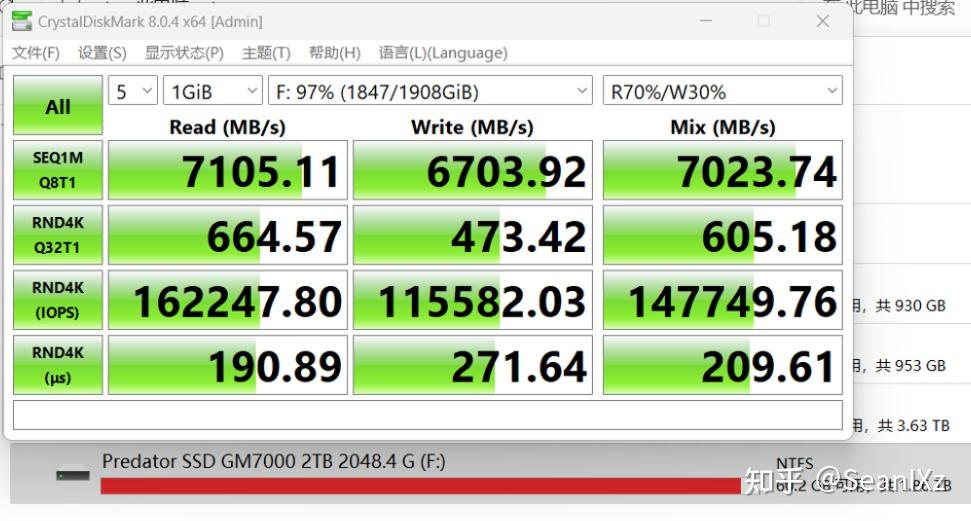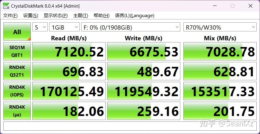 在CrystalDiskMark 1GB大小文件 5个循环的测试中时持续读写速度为7120.52MB/s、6675.53MB/s,读取70% /写入30%混合模式速度7028.78MB/s,表现不错。Intel平台速度略有限制,在AMD平台一般都是可以跑到7400MB/s读取满分的。