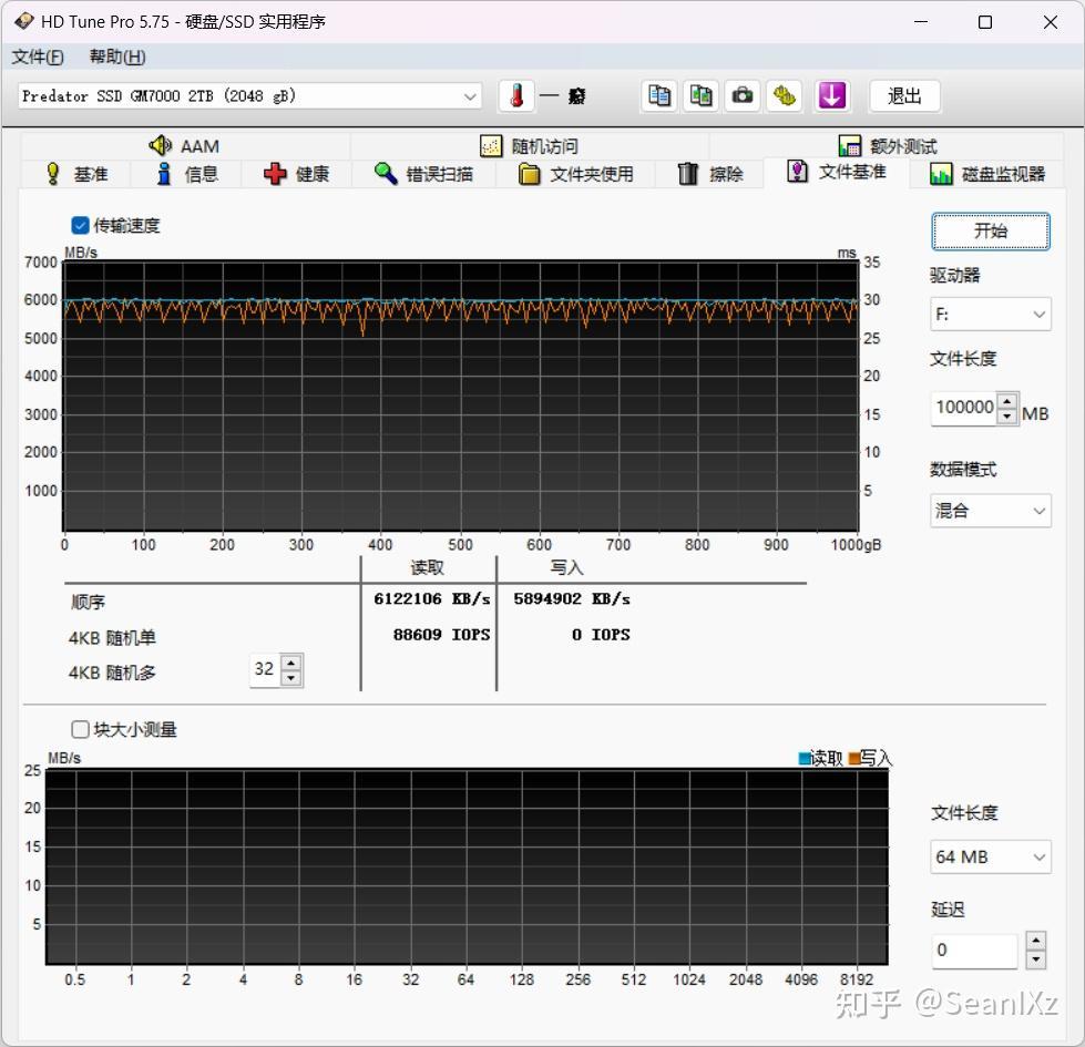 由于SSD无法通过软件显示出缓存信息,通常使用HD Tune Pro的文件基准测试来查看缓存容量以及缓存内外读写速度,大文件读写可以去掉缓存带来的加速,更反映真实值。