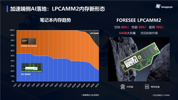 江波龙的另一款首发新品是FORESEE LPCAMM2内存,支持LPDDR5、LPDDR5x,单条容量达16/32/64GB。